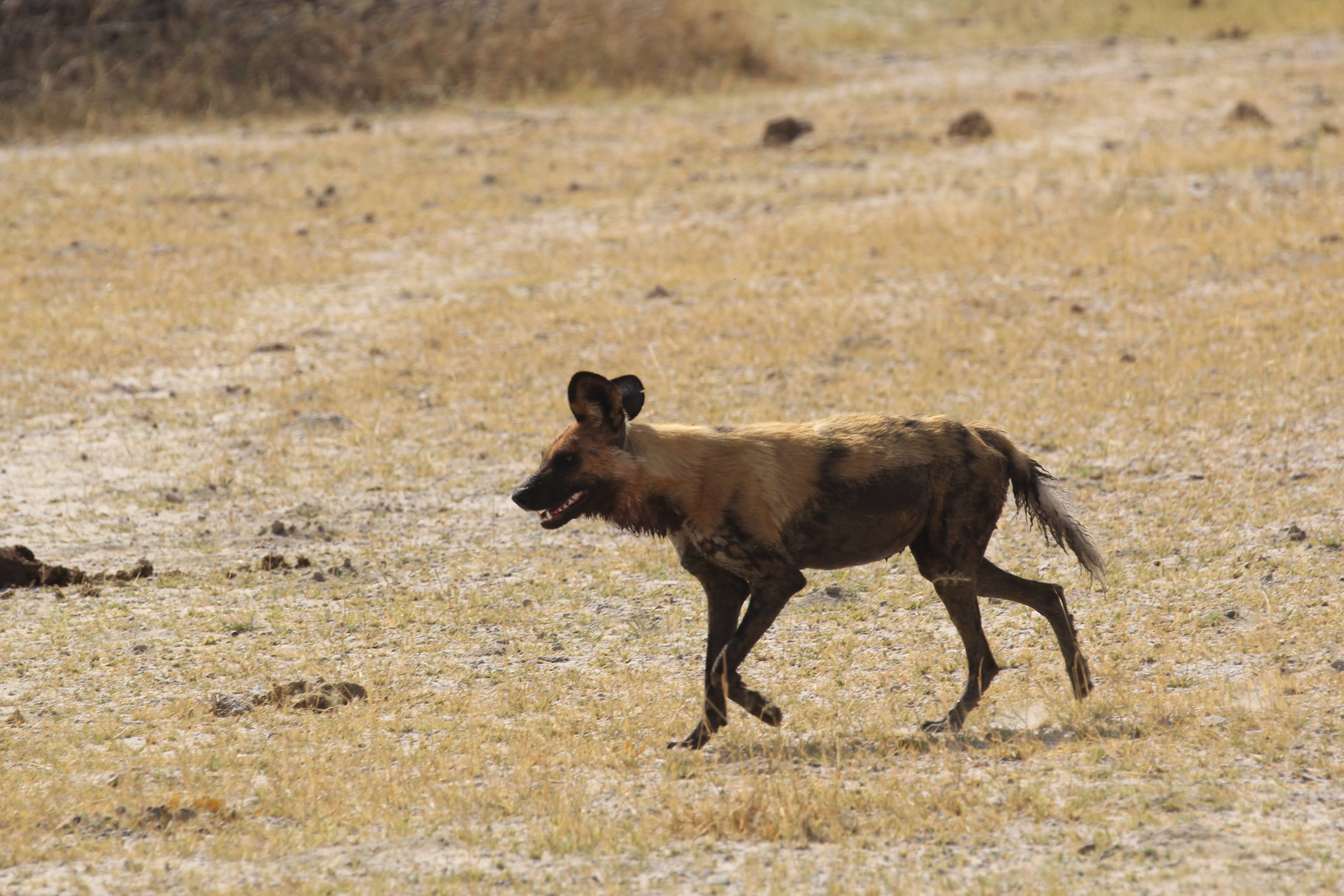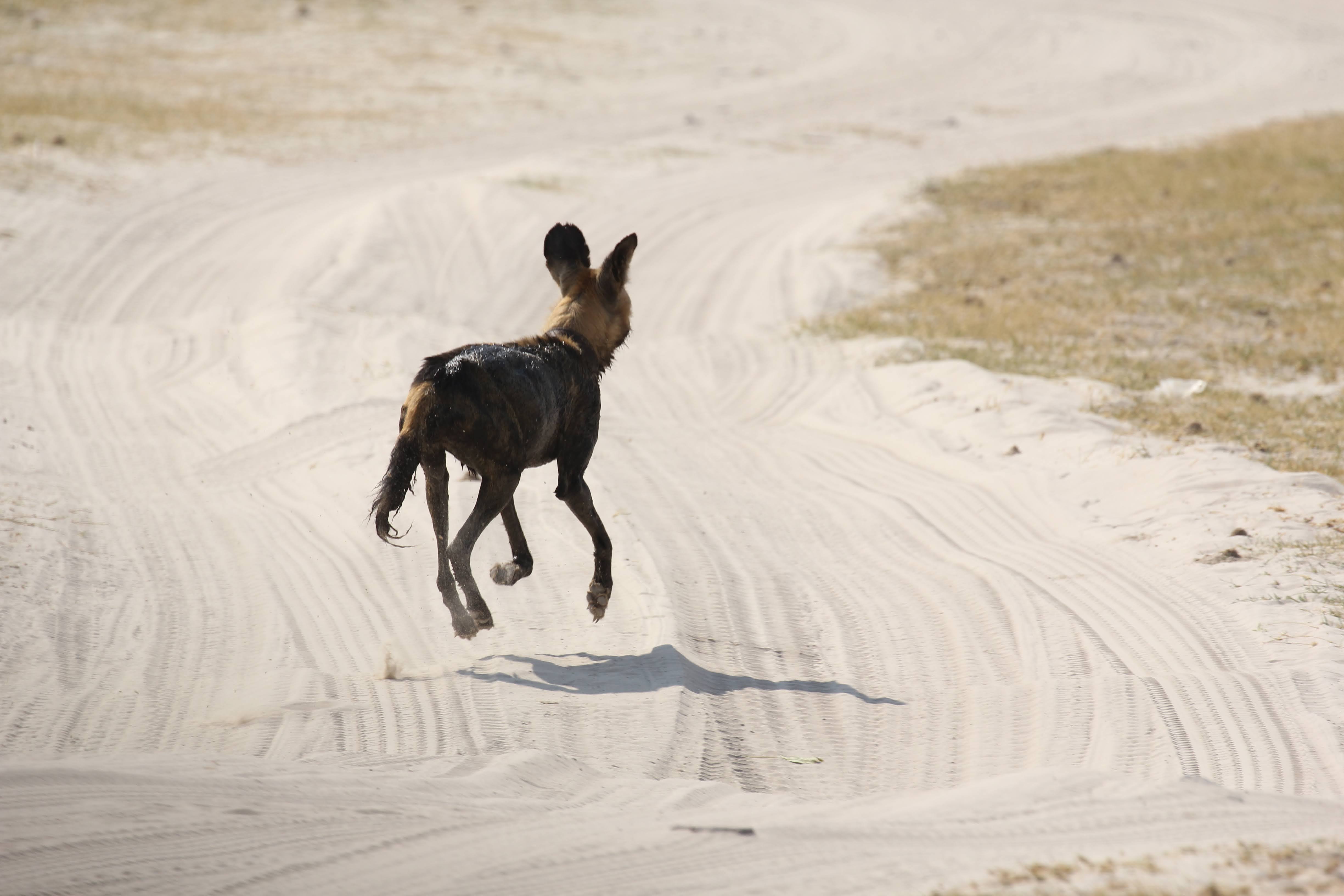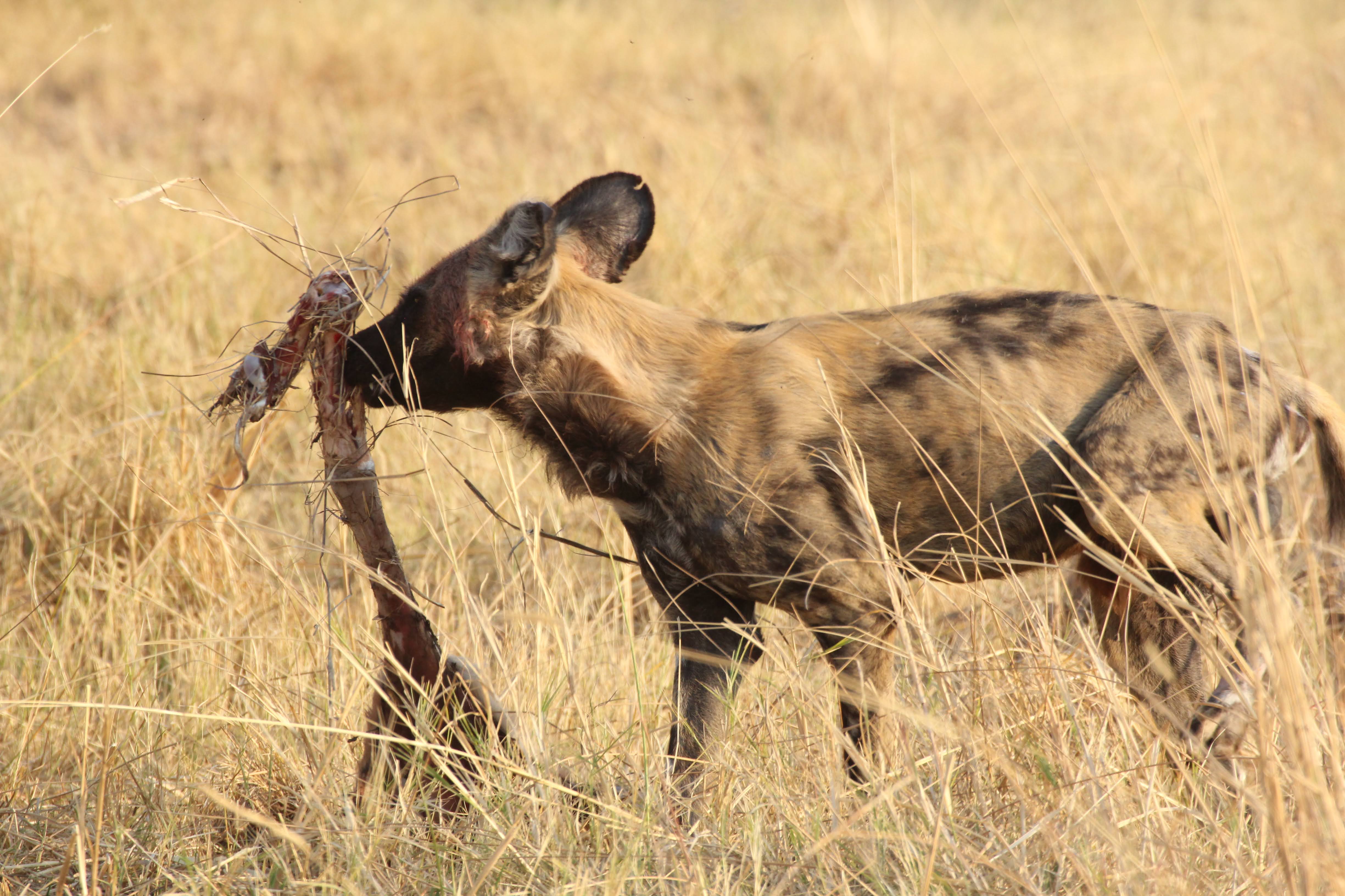 And as we were just thinking things were wrapping up for the day, another wild dogs kill. We raced to the scene, but got there right as they had finished gorging themselves and were running away from the kill. 5 dogs this time, one of them appeared to have a tracking color on. They can really run even when they are carrying probably 10 pounds of meat in their stomachs. Quite impressive animals.