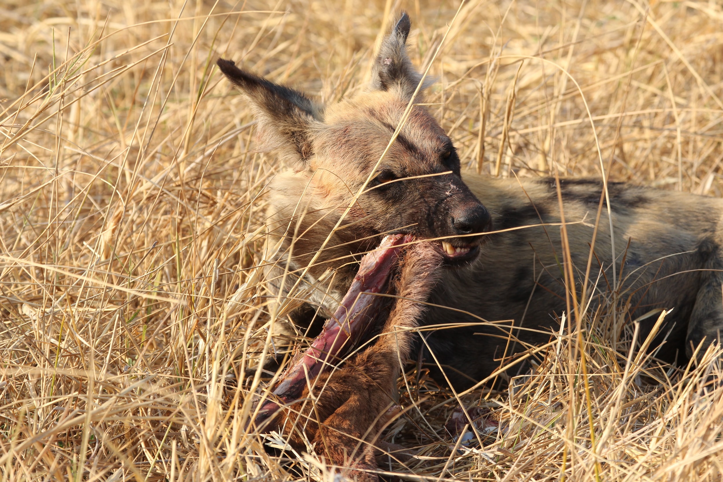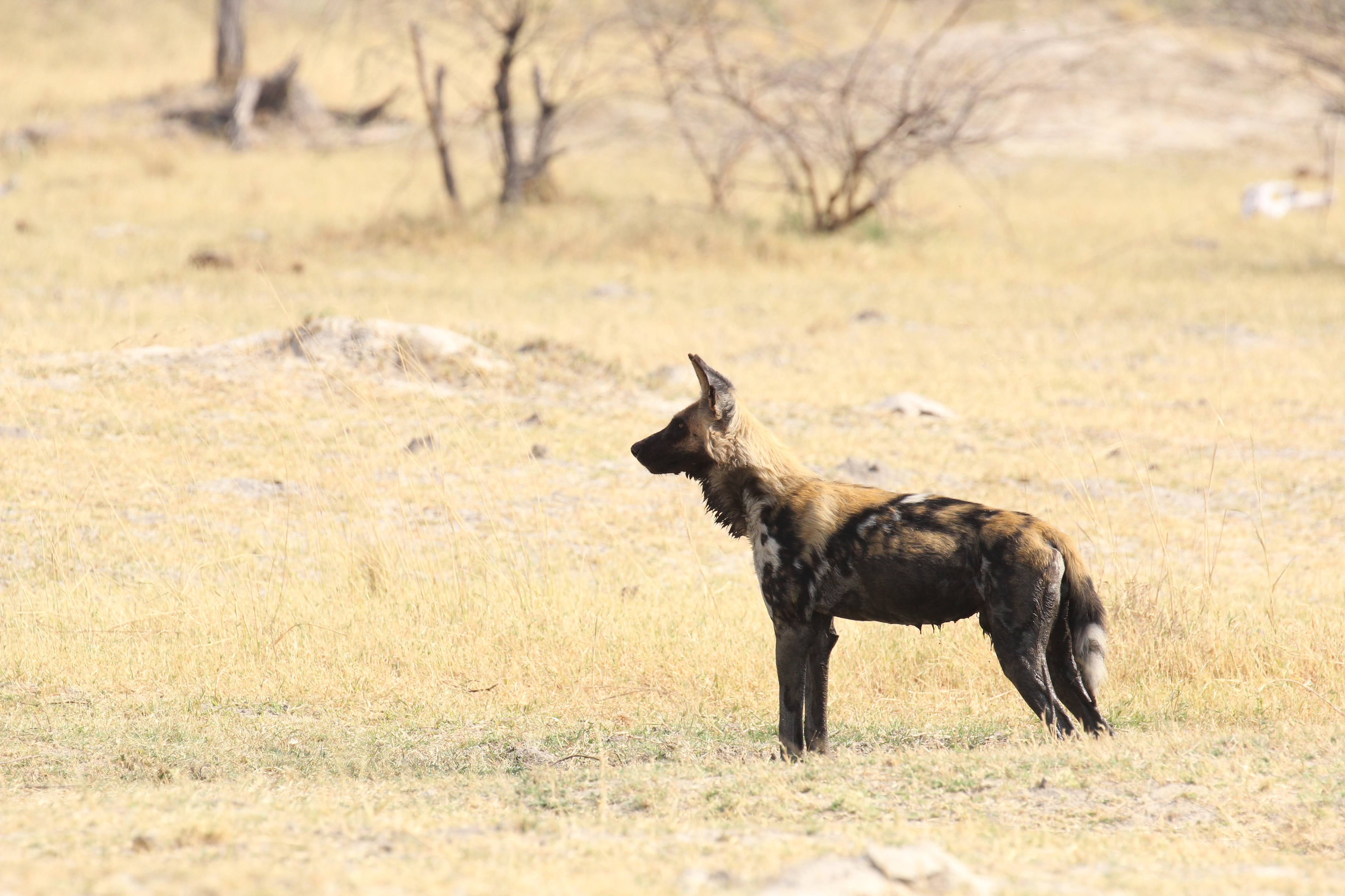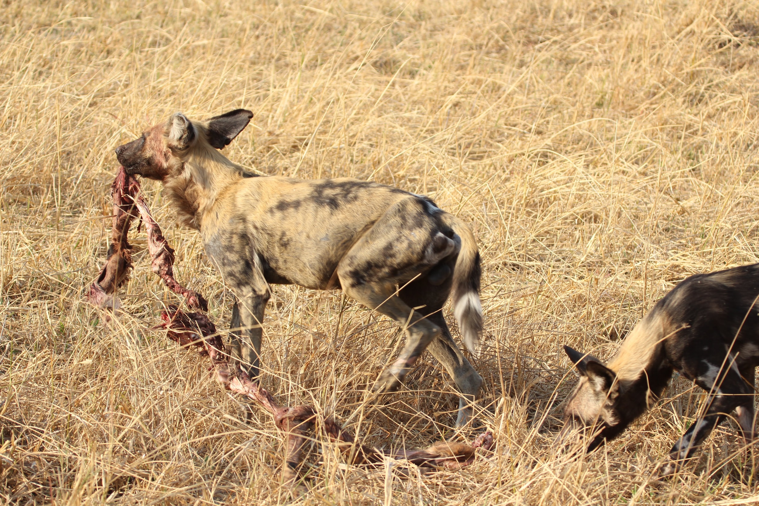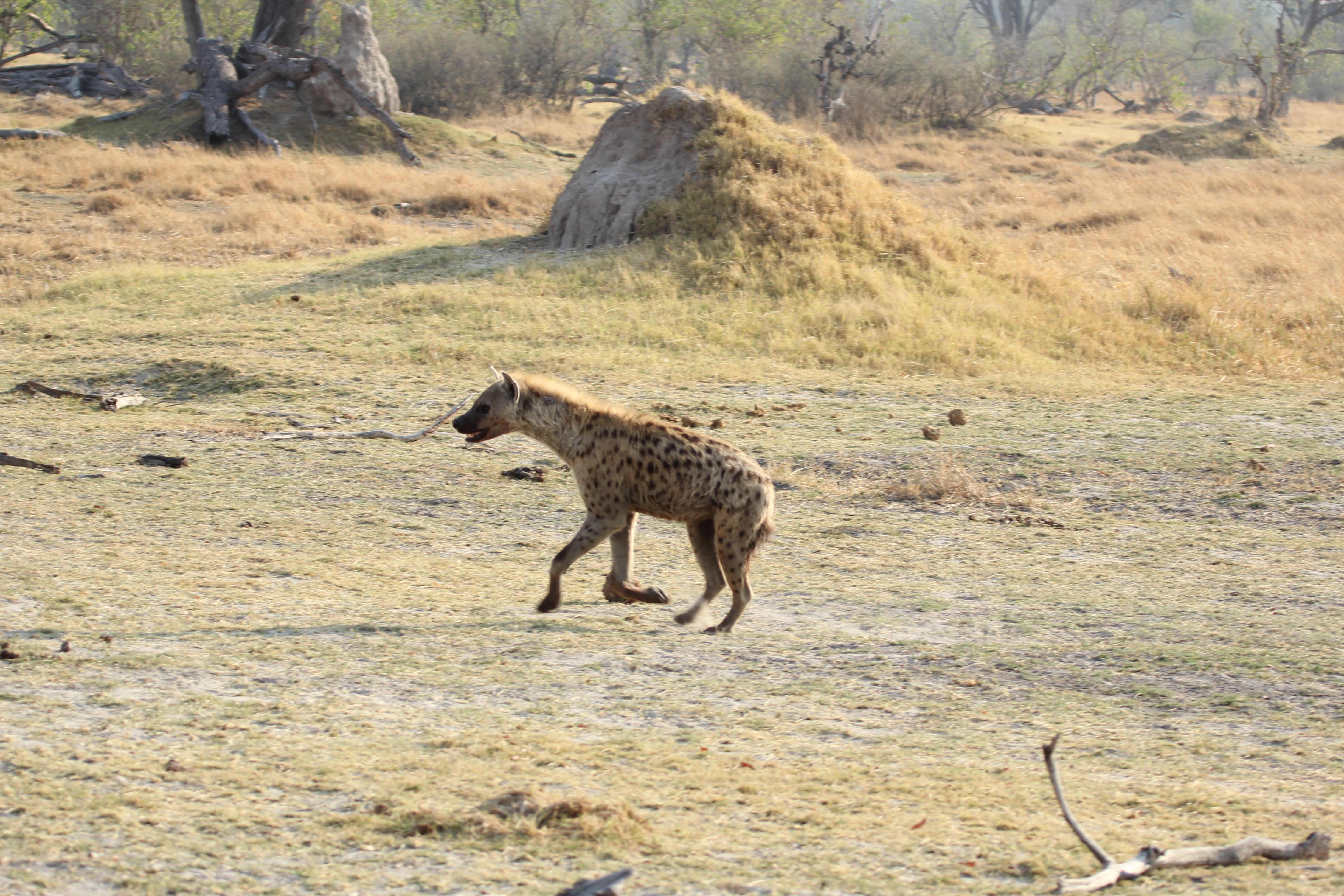 Our guide spotted a Hyena nearby the kill. He was alone and clearly hoping to scare these dogs off of the kill. Unfortunately for him, he was by himself and there were ~8 dogs on the kill. He seemed to recognize this, so he just watched from a distance. Maybe he was hoping that a couple of the dogs would run off early or another Hyena would show up and they could push the dogs off the kill. Hyenas are the opposite of Lechwe - they have really powerful front legs and weaker back ones. I’m not totally sure why that is, but it does give them a very particular look when they are running. Apparently they are quite powerful and they can run for miles and miles. It’s also a myth that they are primarily scavengers, a pack of Hyenas are hunters and can take down some big prey. But any predator here (or most places in the world) will always take advantage of a recently deceased animal, even if they weren’t the one that killed it. If you look closely, you could seem him salivating a little bit, he really wanted to eat that thing. :)