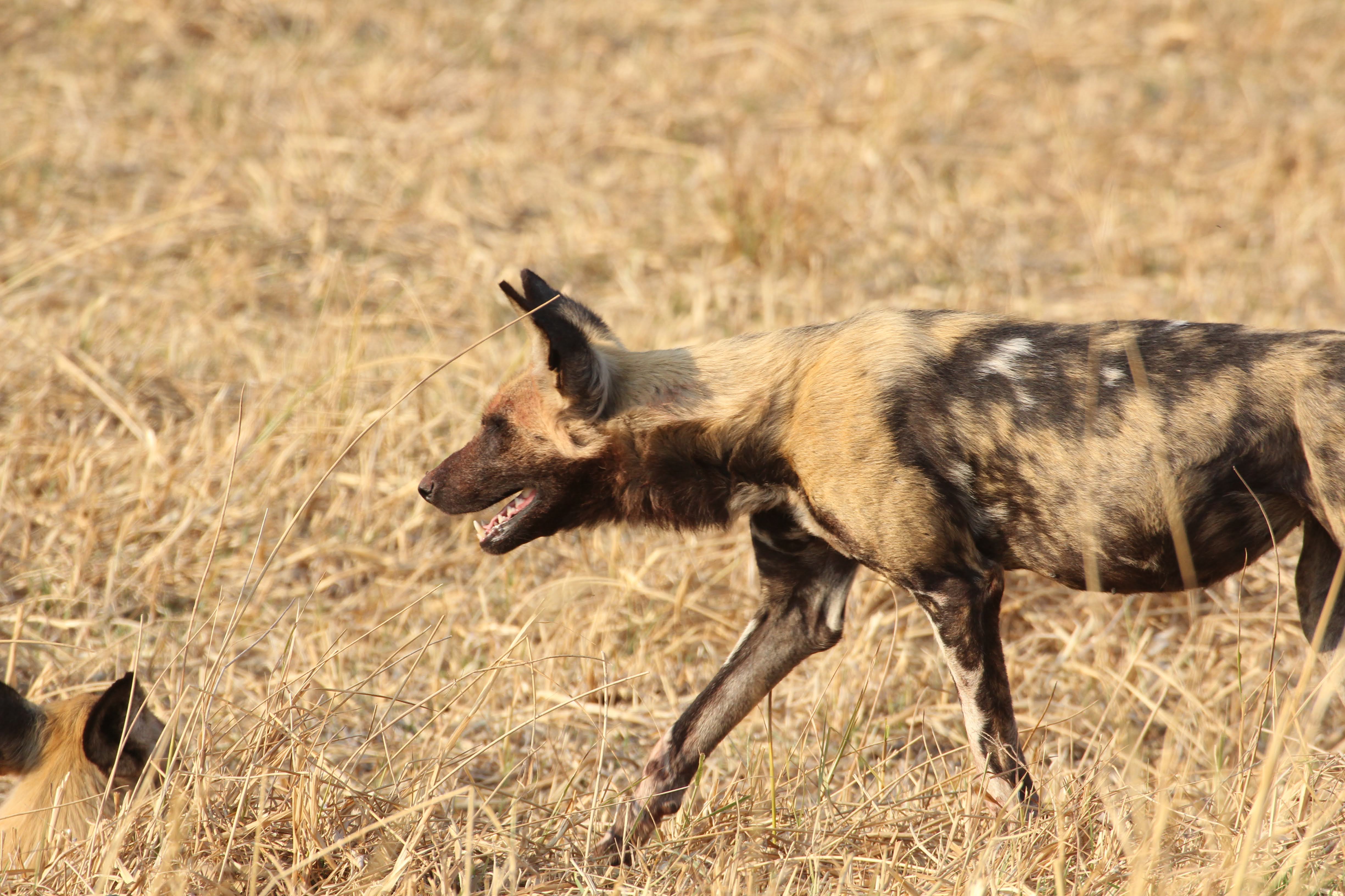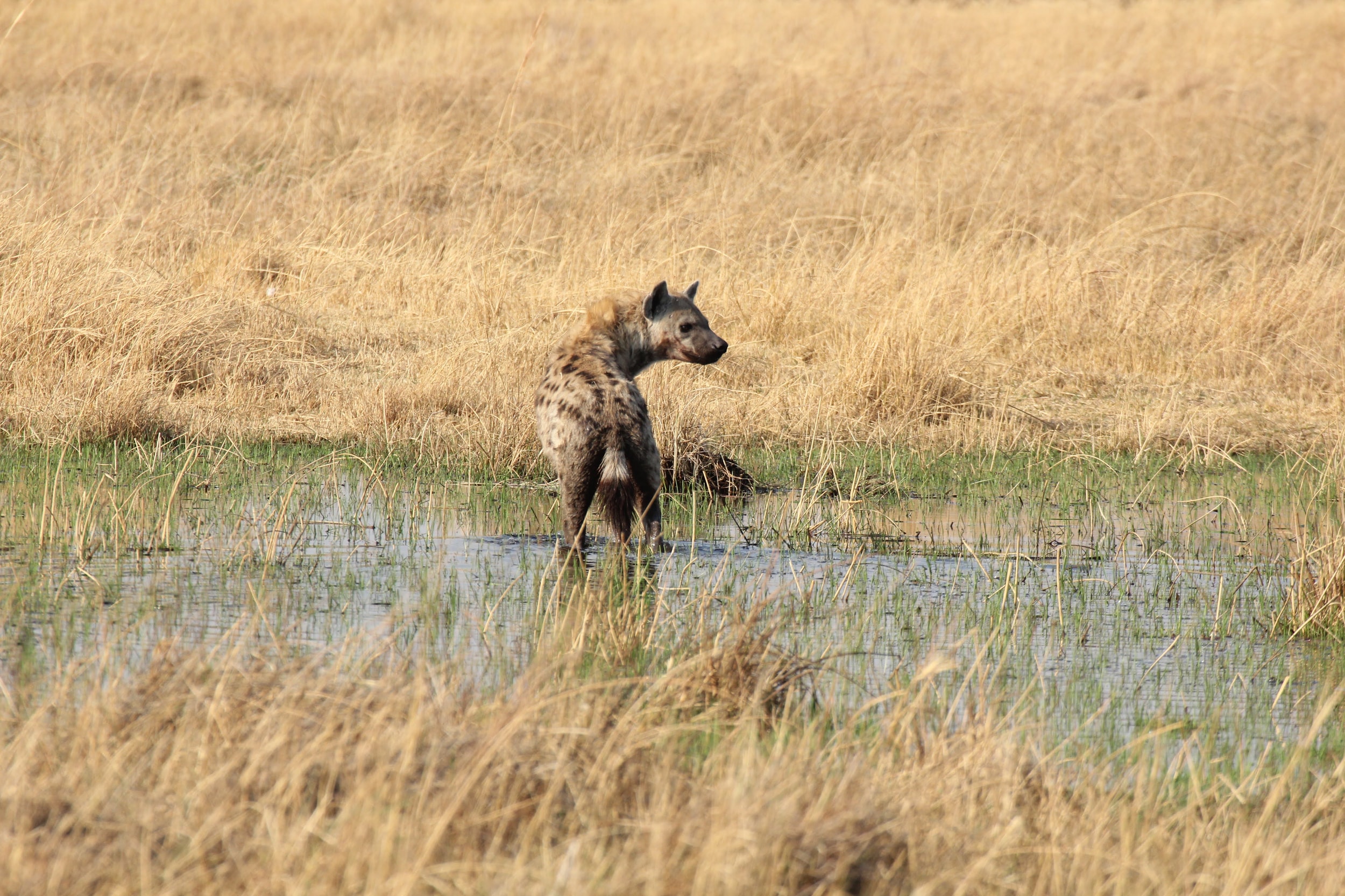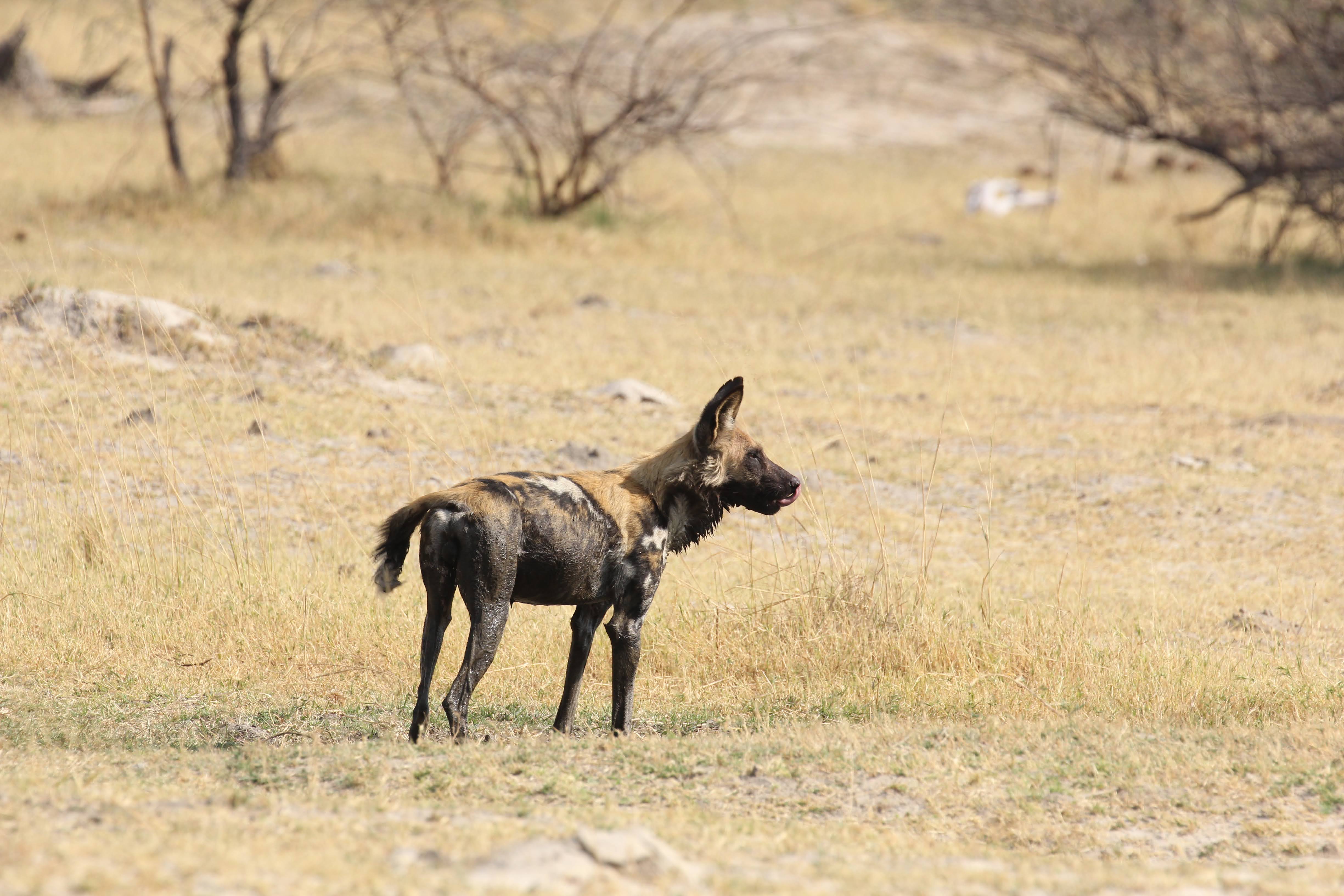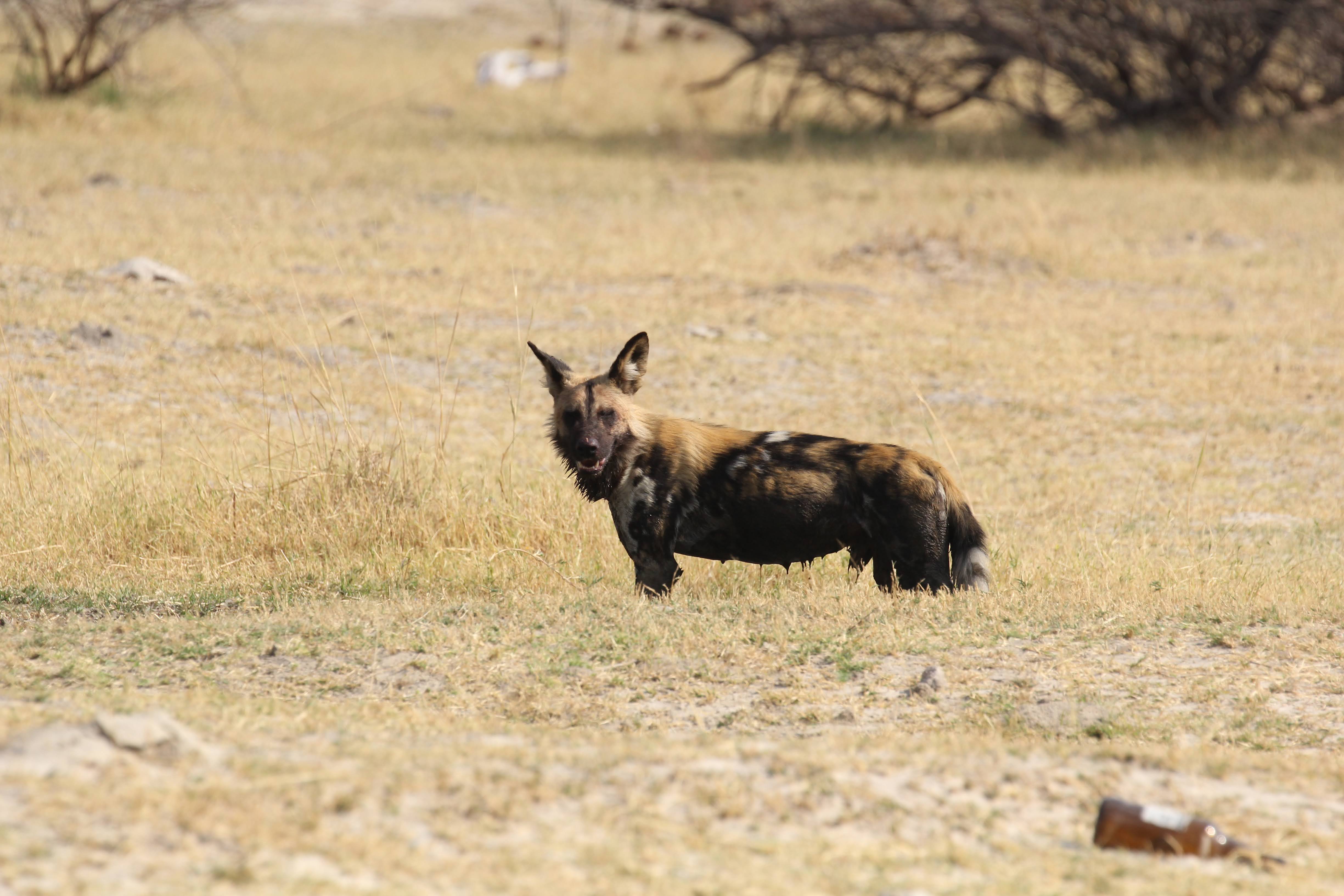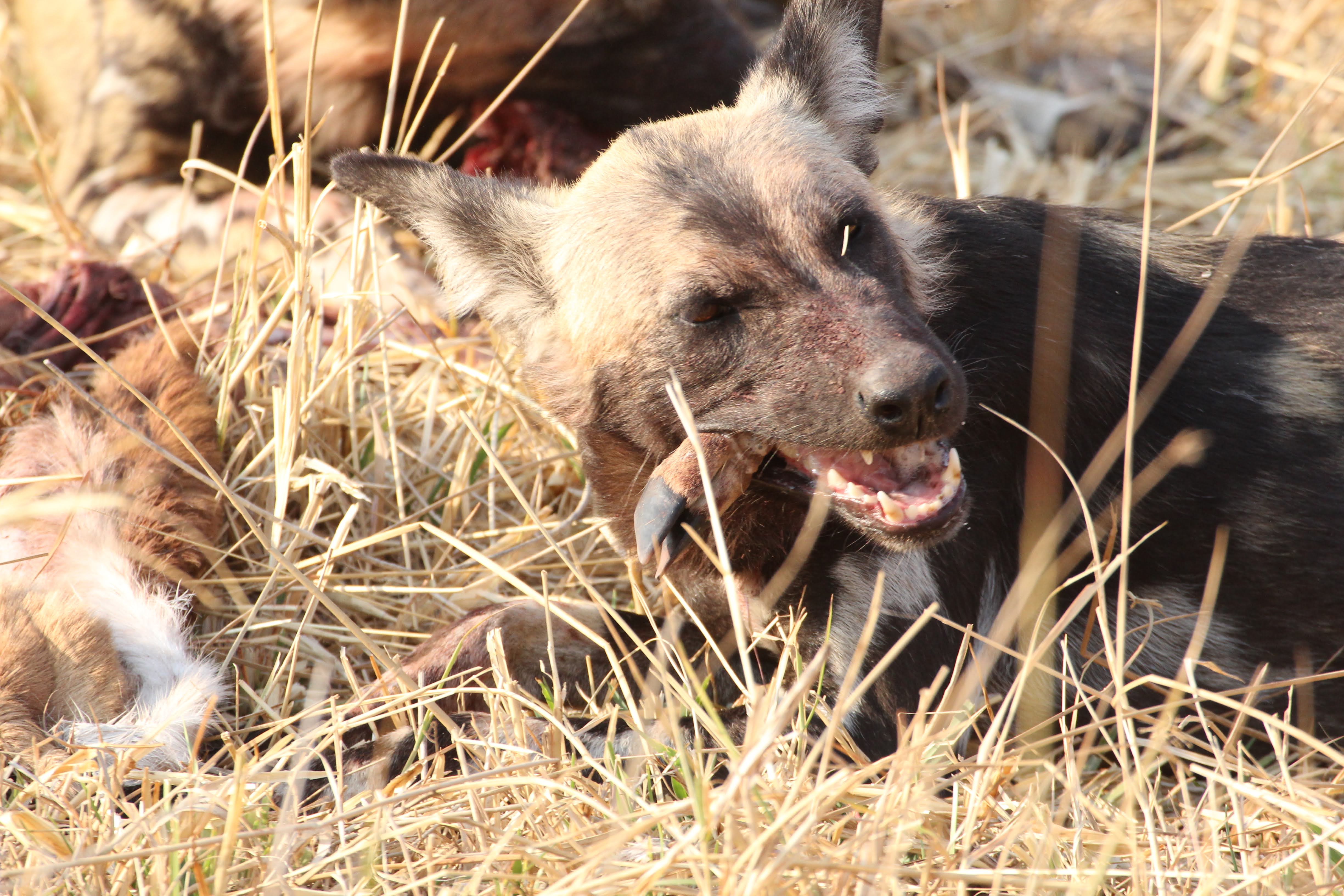 Our guide spotted a Hyena nearby the kill. He was alone and clearly hoping to scare these dogs off of the kill. Unfortunately for him, he was by himself and there were ~8 dogs on the kill. He seemed to recognize this, so he just watched from a distance. Maybe he was hoping that a couple of the dogs would run off early or another Hyena would show up and they could push the dogs off the kill. Hyenas are the opposite of Lechwe - they have really powerful front legs and weaker back ones. I’m not totally sure why that is, but it does give them a very particular look when they are running. Apparently they are quite powerful and they can run for miles and miles. It’s also a myth that they are primarily scavengers, a pack of Hyenas are hunters and can take down some big prey. But any predator here (or most places in the world) will always take advantage of a recently deceased animal, even if they weren’t the one that killed it. If you look closely, you could seem him salivating a little bit, he really wanted to eat that thing. :)