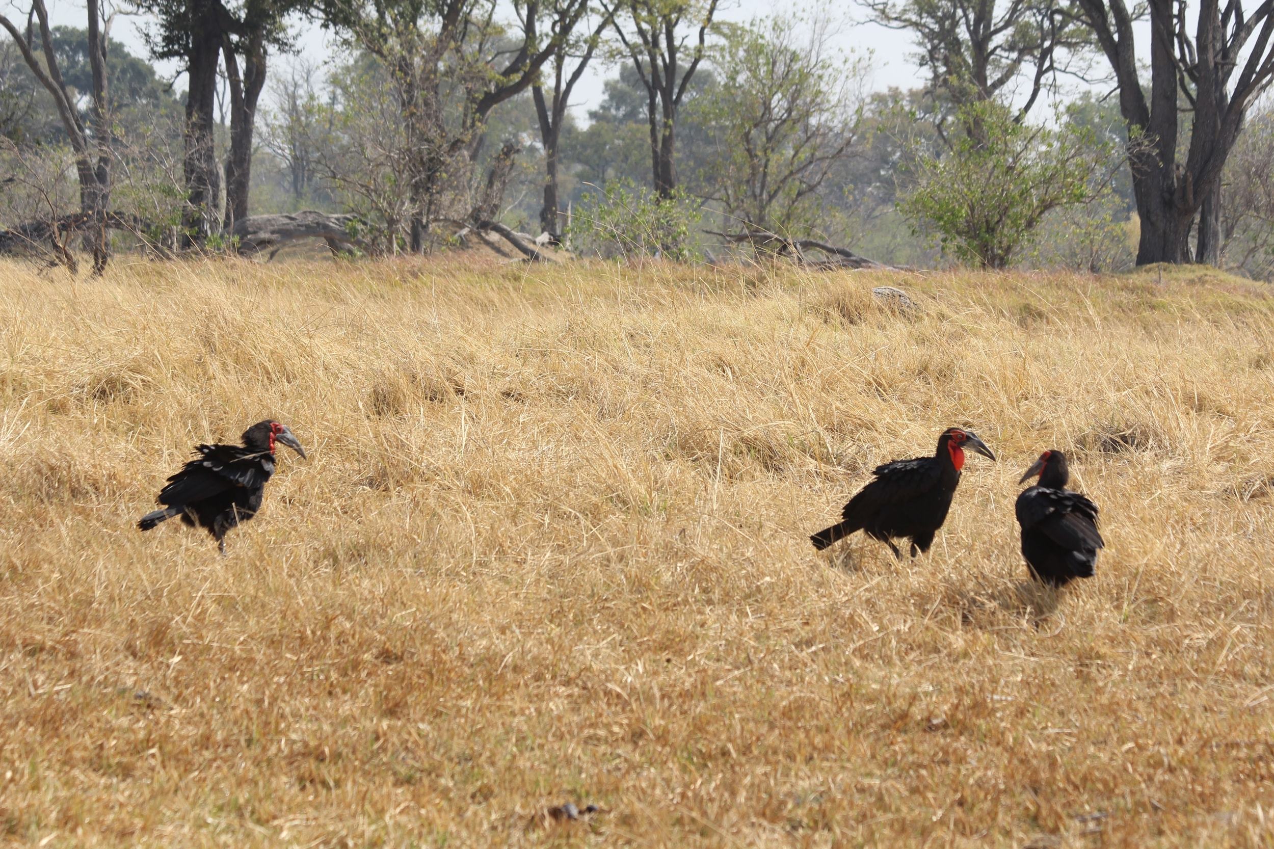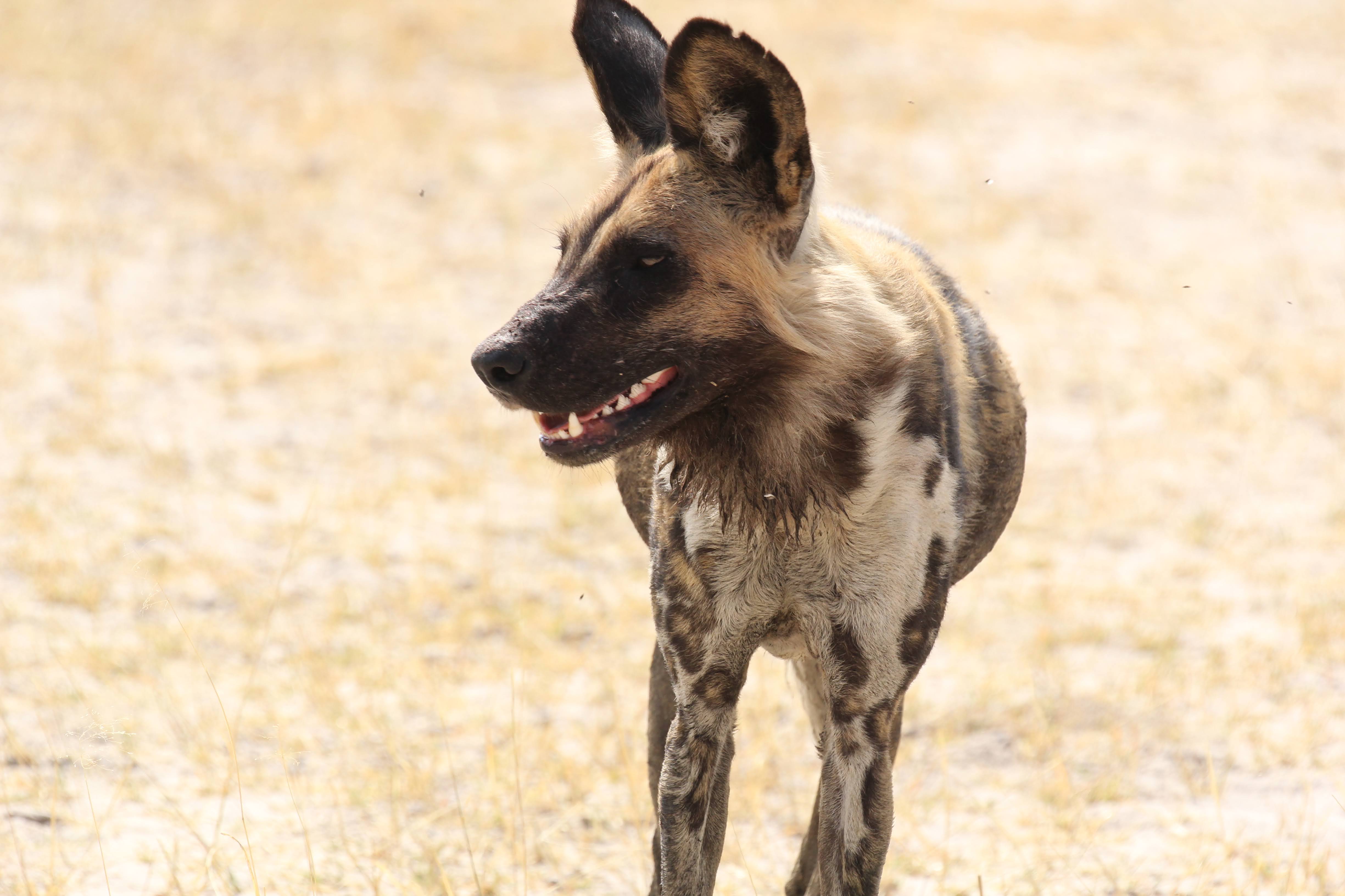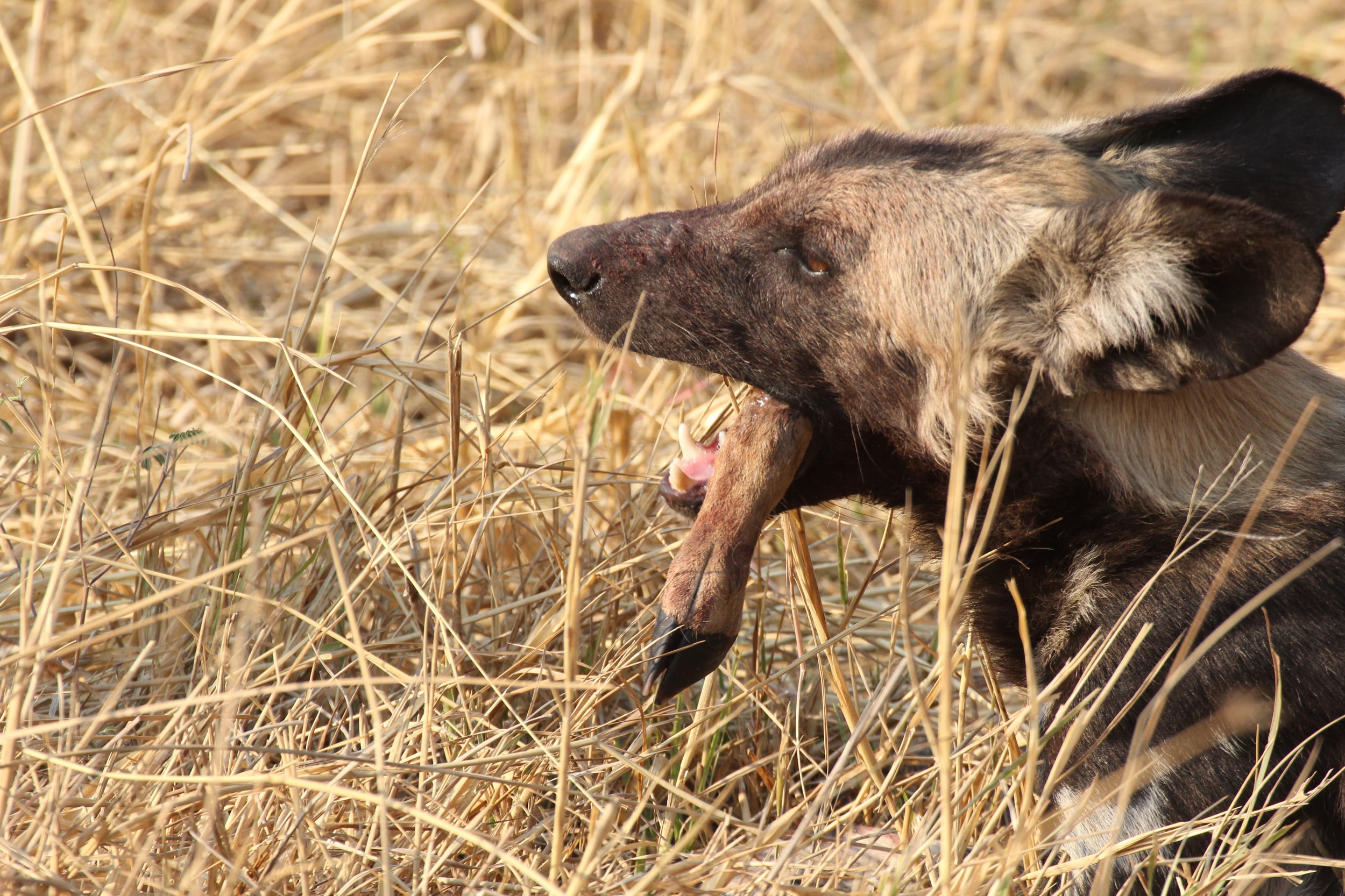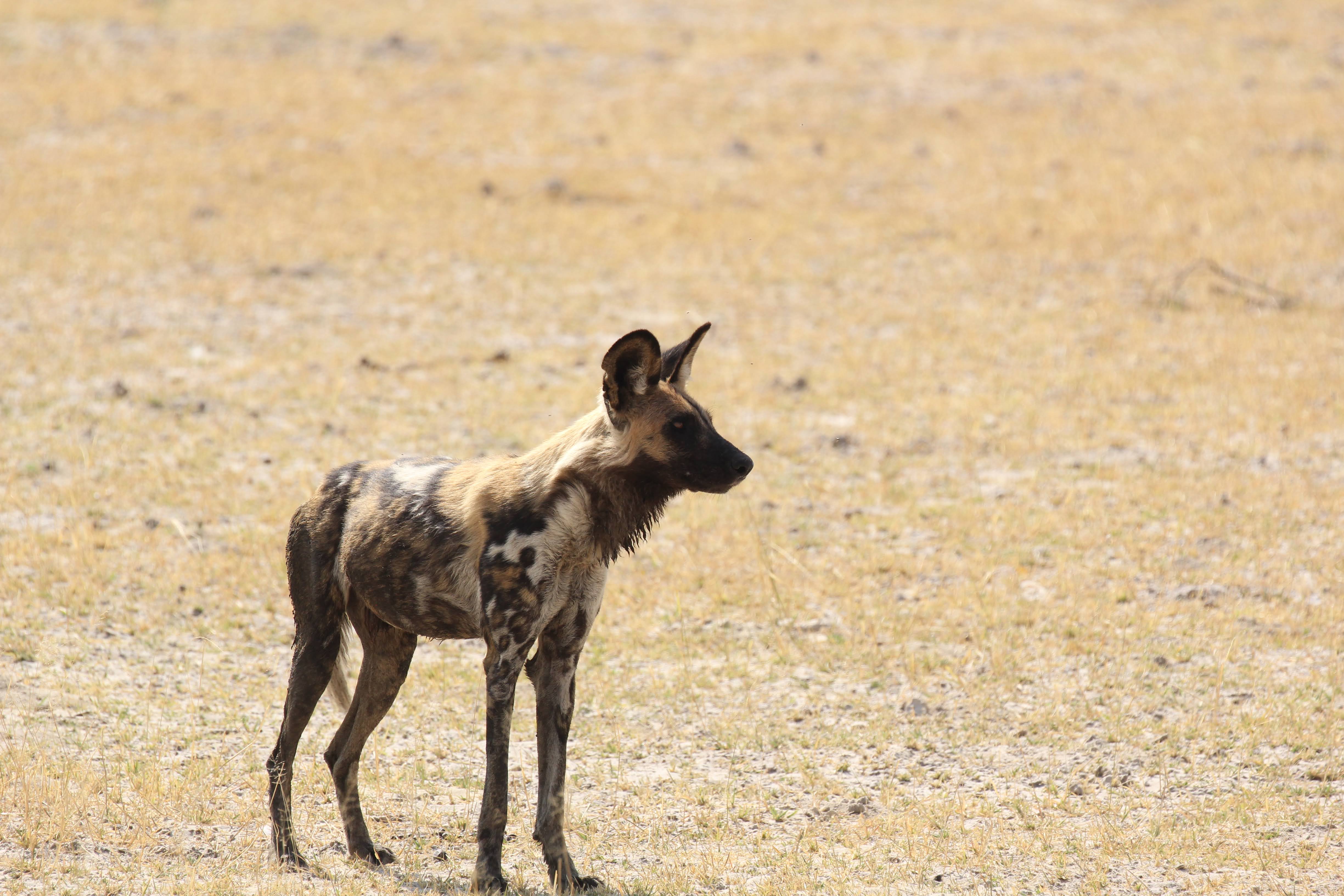 Our guide spotted a Hyena nearby the kill. He was alone and clearly hoping to scare these dogs off of the kill. Unfortunately for him, he was by himself and there were ~8 dogs on the kill. He seemed to recognize this, so he just watched from a distance. Maybe he was hoping that a couple of the dogs would run off early or another Hyena would show up and they could push the dogs off the kill. Hyenas are the opposite of Lechwe - they have really powerful front legs and weaker back ones. I’m not totally sure why that is, but it does give them a very particular look when they are running. Apparently they are quite powerful and they can run for miles and miles. It’s also a myth that they are primarily scavengers, a pack of Hyenas are hunters and can take down some big prey. But any predator here (or most places in the world) will always take advantage of a recently deceased animal, even if they weren’t the one that killed it. If you look closely, you could seem him salivating a little bit, he really wanted to eat that thing. :)