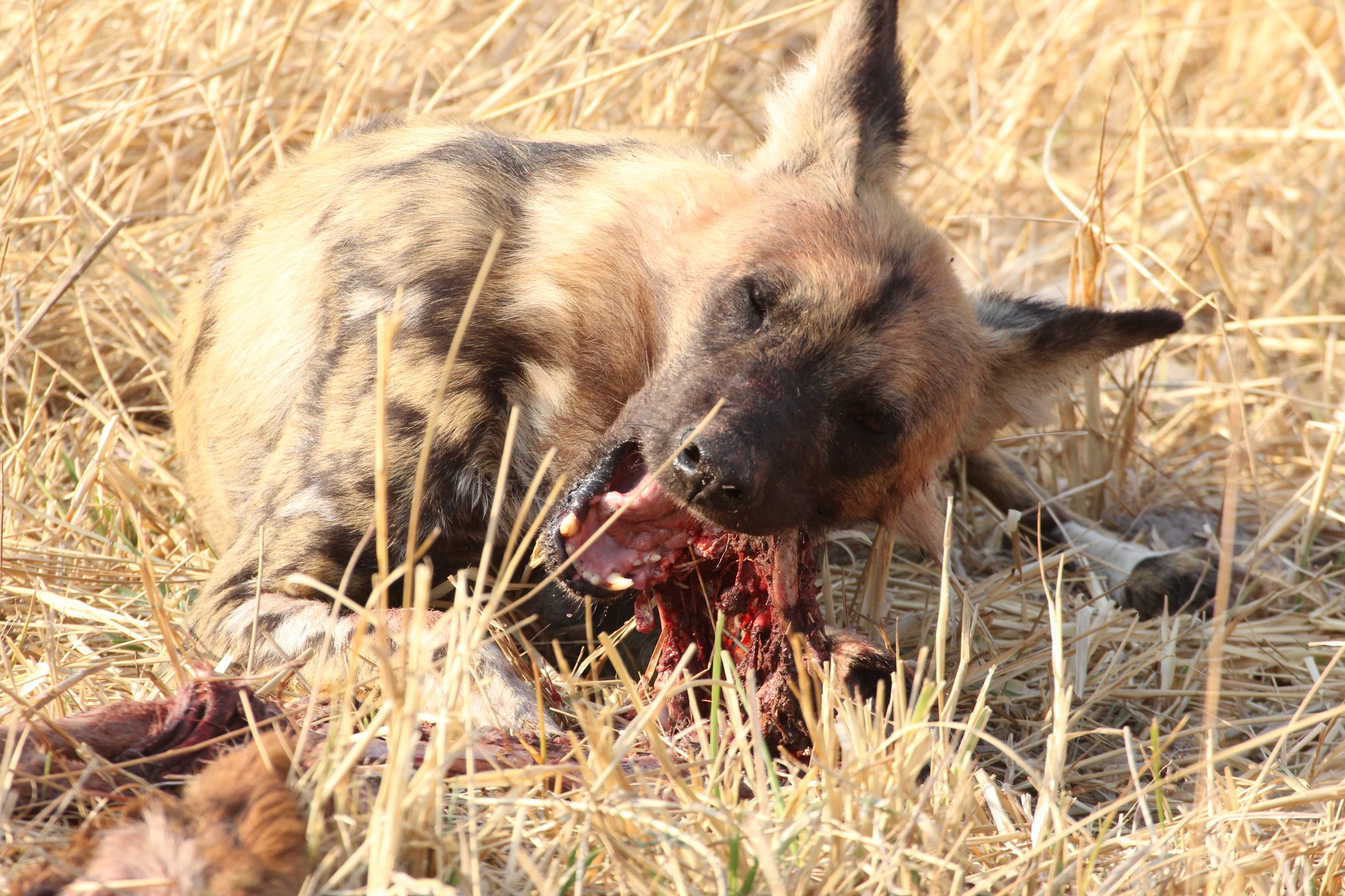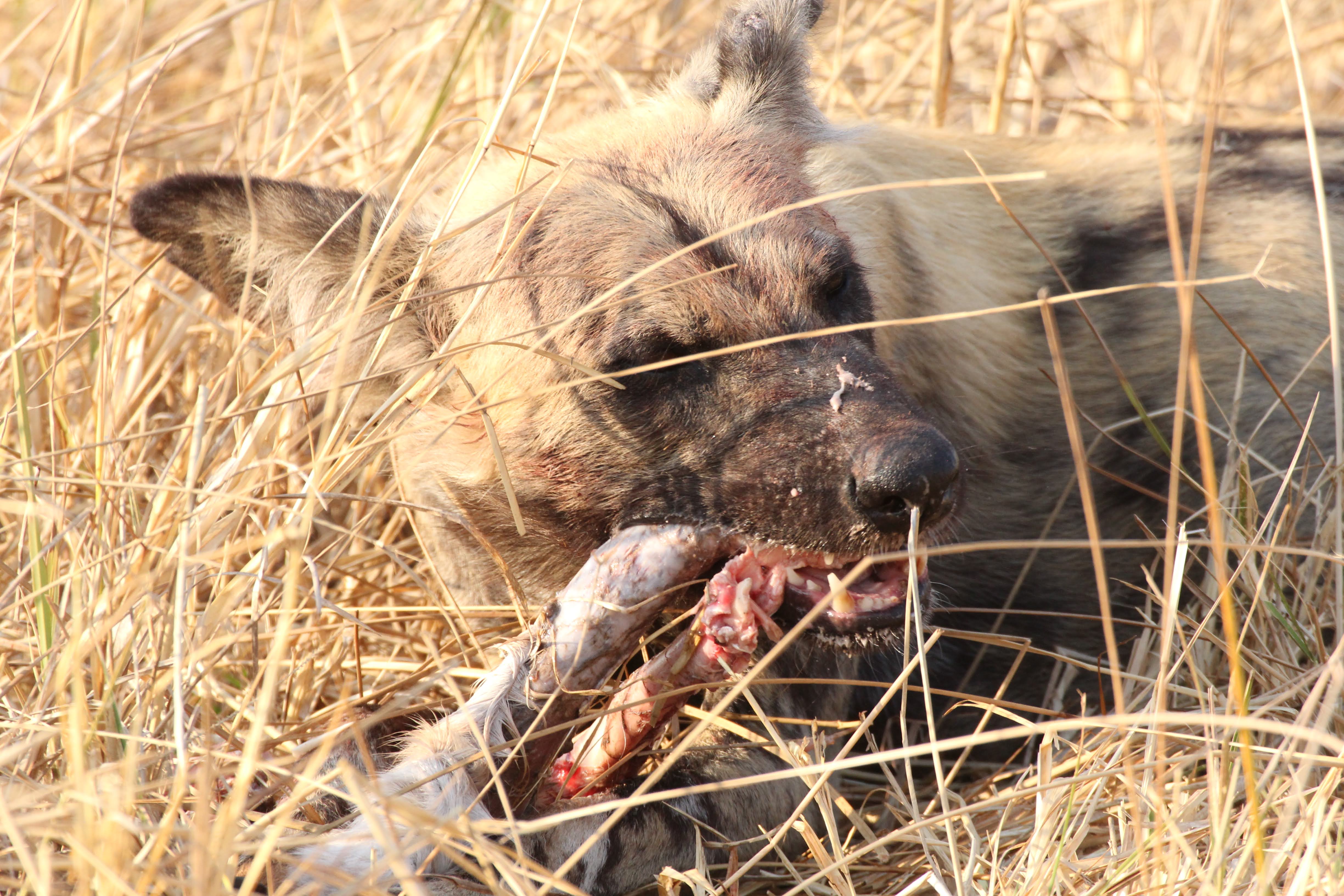 We probably spent 45 minutes driving around before our guide got a call and floored it. We called this Safari Ferrari - It’s not super fast, but you can really feel any speed on these roads throwing you up, down, left, and right. Apparently there was something to see somewhere else - the guides we always very cryptic about what was coming, probably because you just never know if whatever is happening is still happening when you get there… Turn out, a pack of wild dogs had just taken down an Impala - it was an amazing but also a bit of a grotesque sight. The amazing part was how they ate - which was very quickly. The dogs can be pushed off a kill very easily by lots of other predators, so they need to eat the entire thing in just a few minutes and then they are off running again. We didn’t see the takedown, but we have heard that the dogs will actually start eating their prey while they are still running. This is nature…