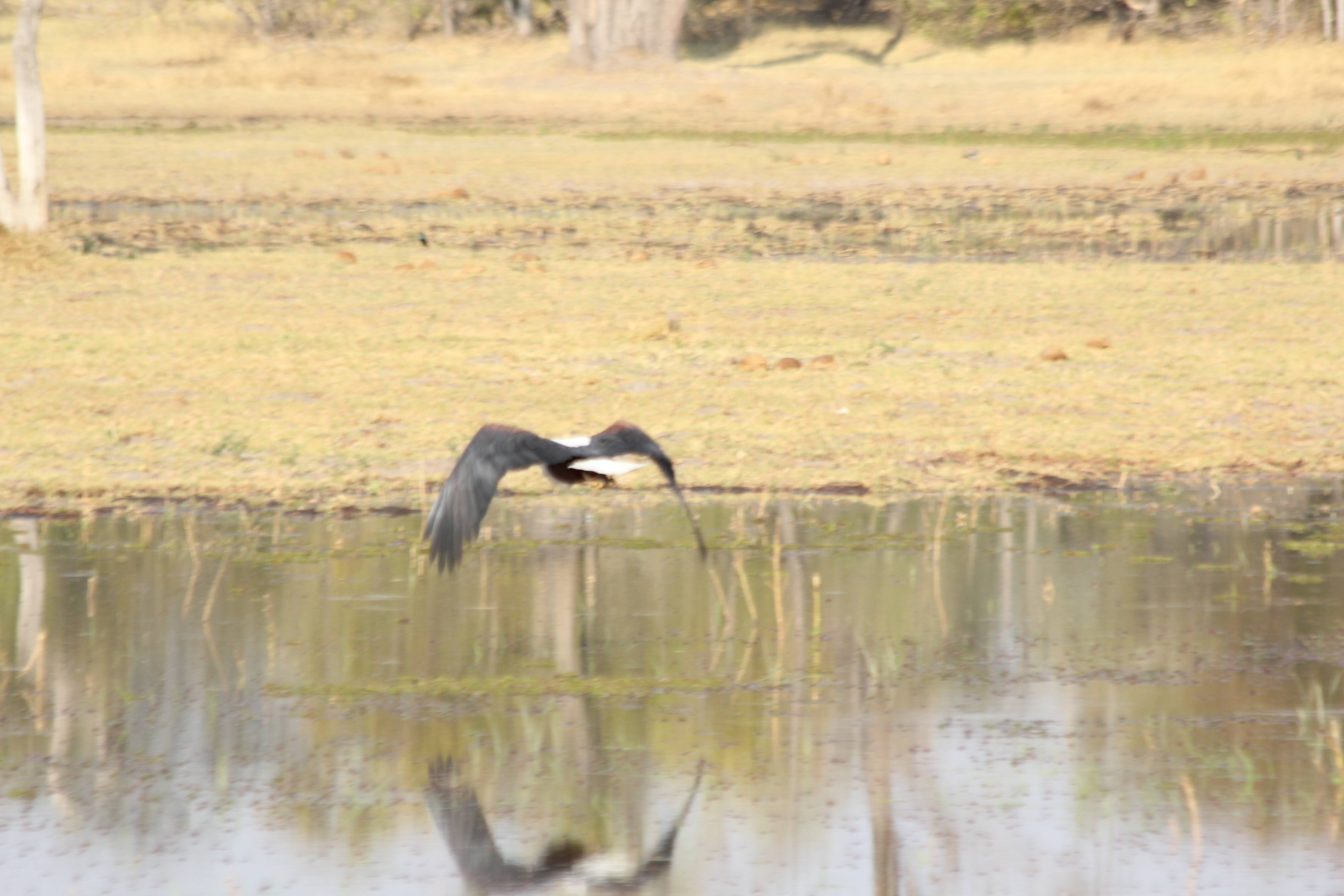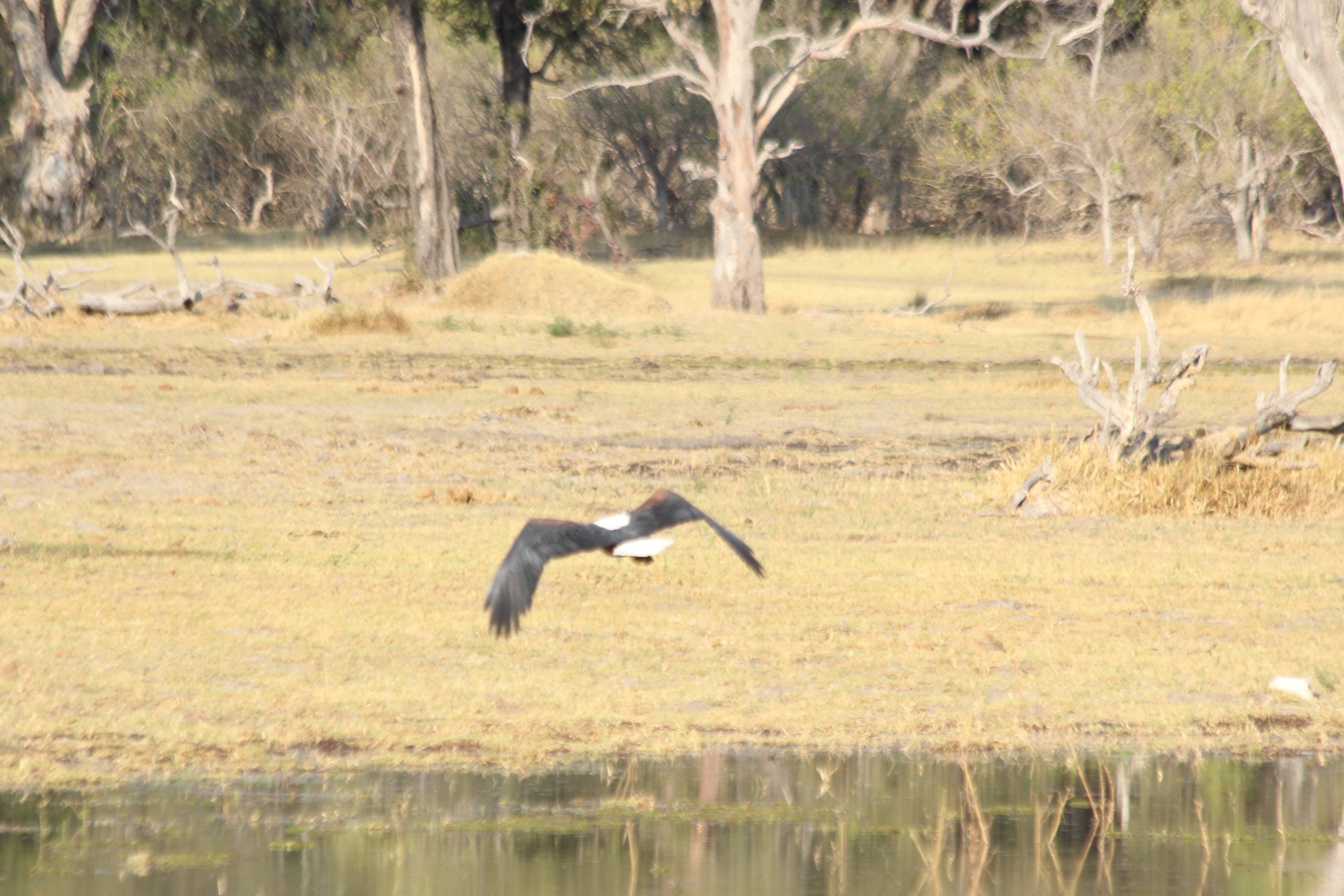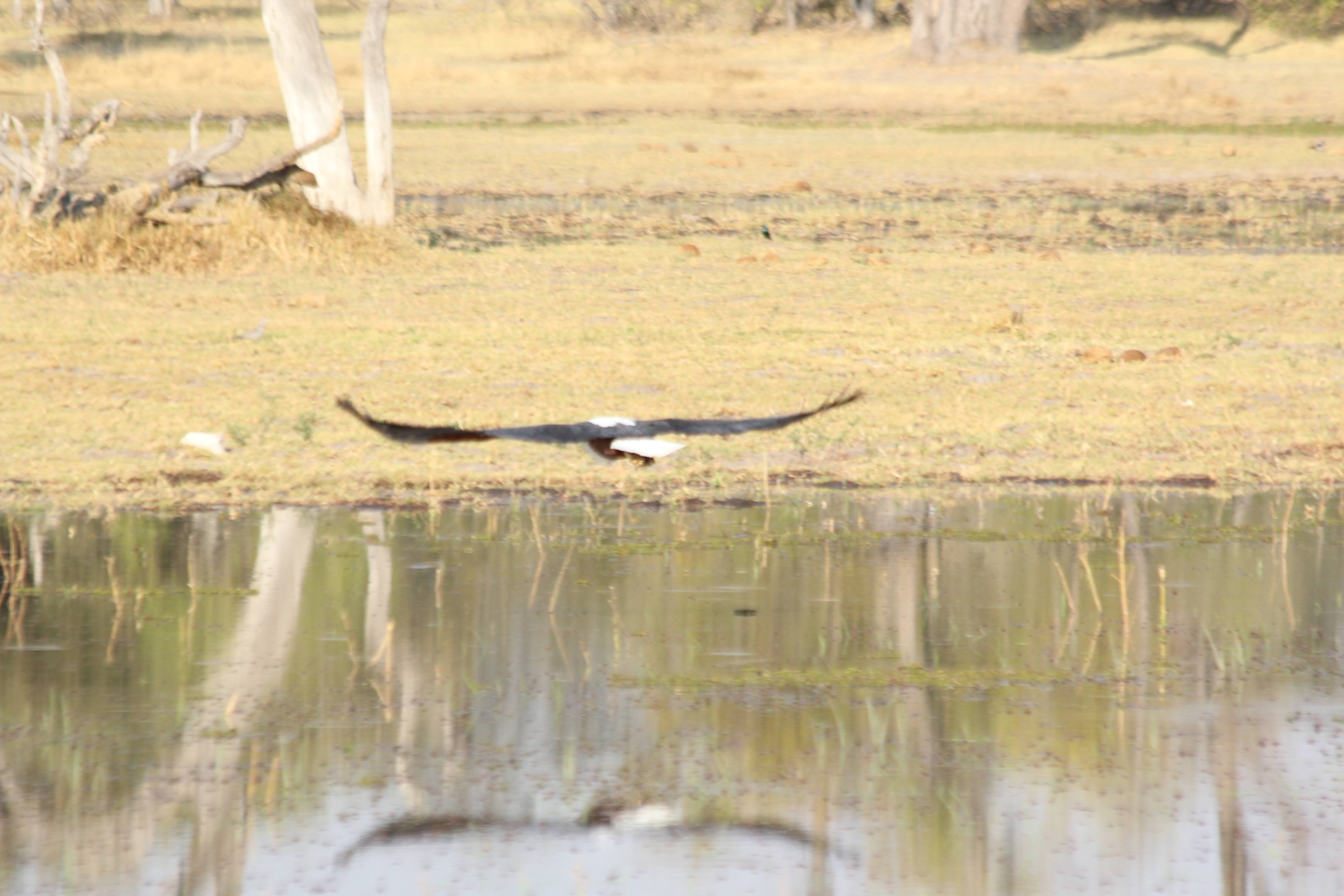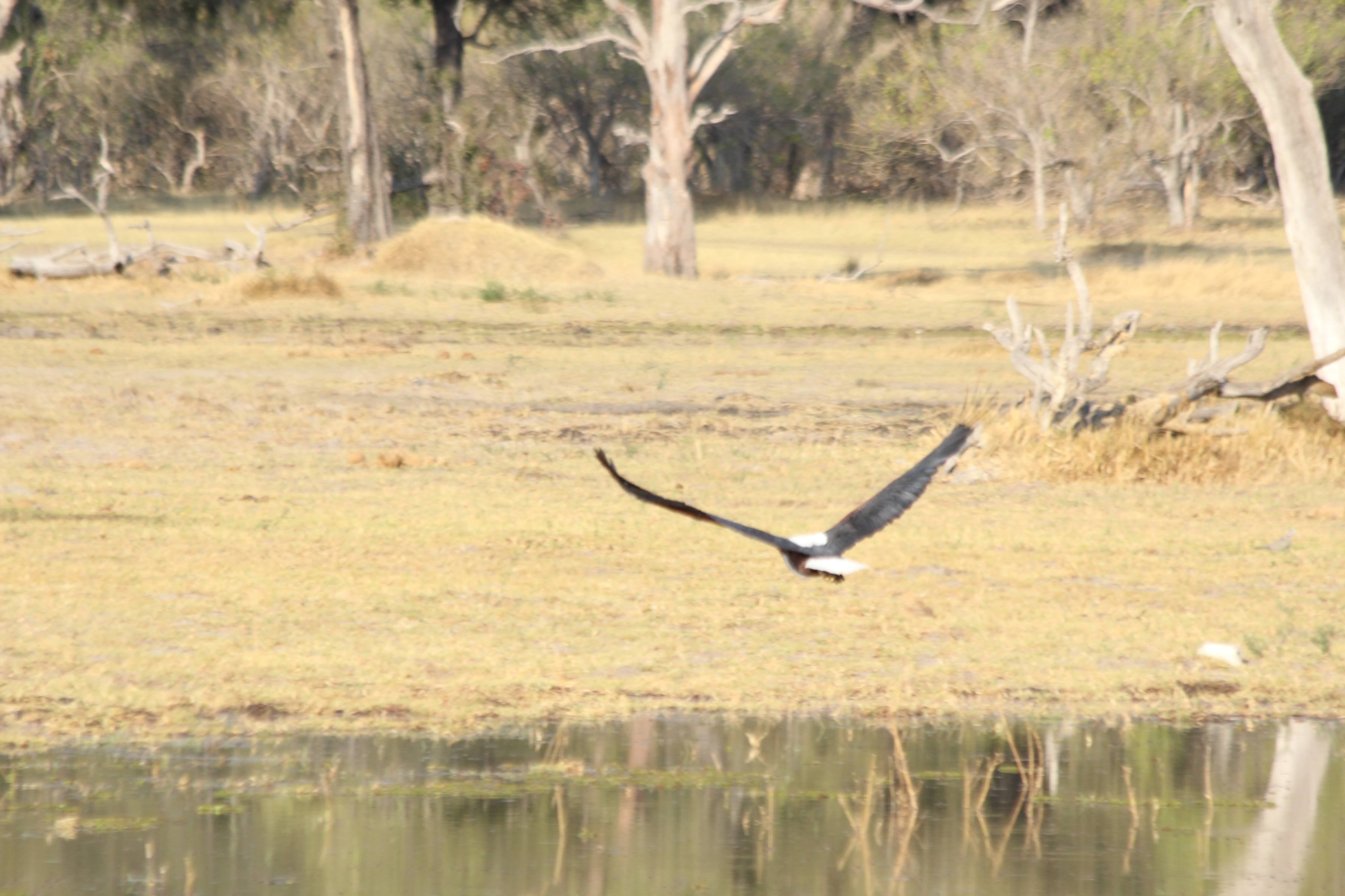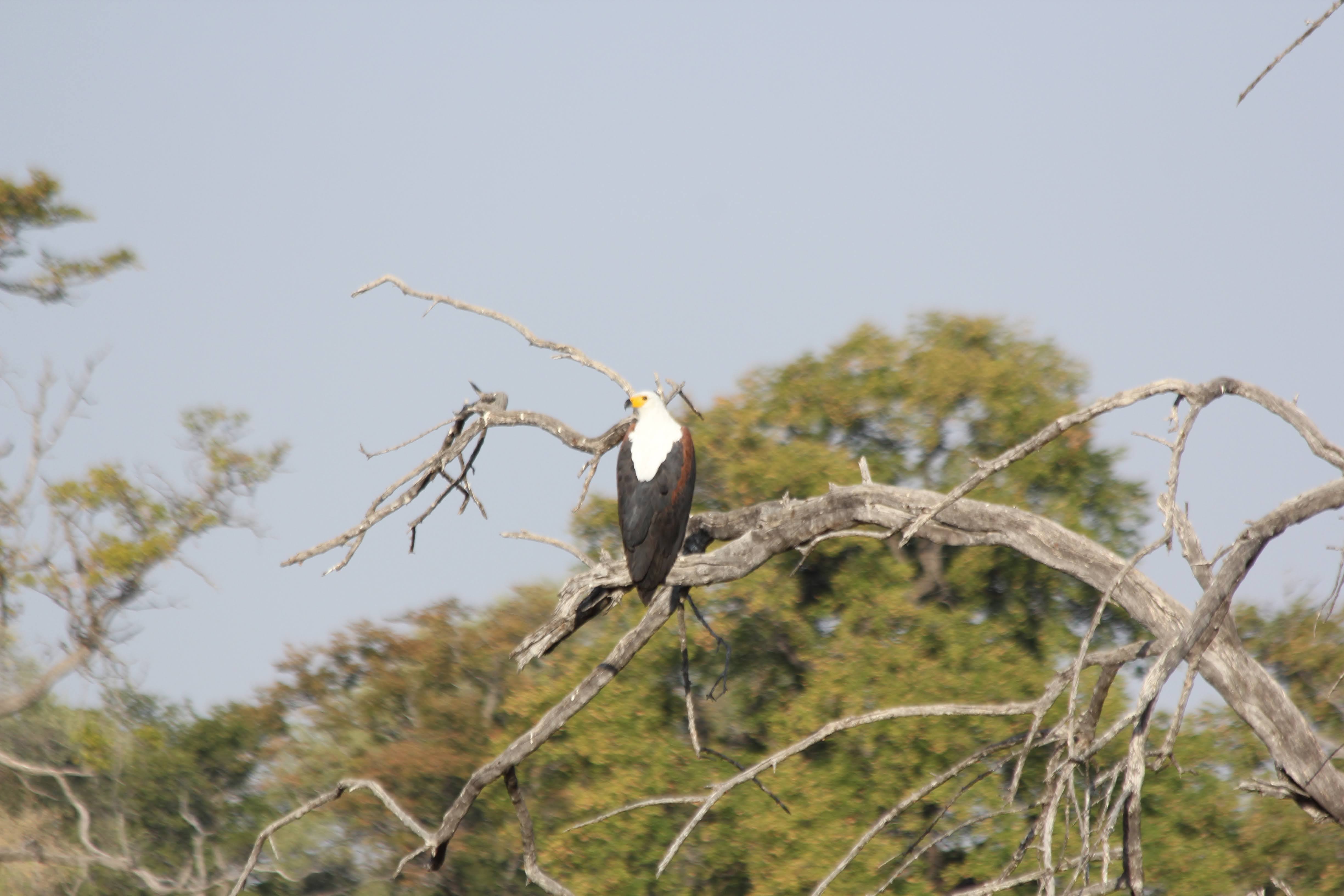 Diane spotted a fish eagle - this bird is about the same size and coloring as a bald eagle, but it looks a little sleeker - bald eagles look scruffy by comparison. It also sounded like their diet and behaviors were very similar to the bald eagle - big nest, eats mostly fish, long-term mating pair. I got some pretty good pictures of one of them flying.