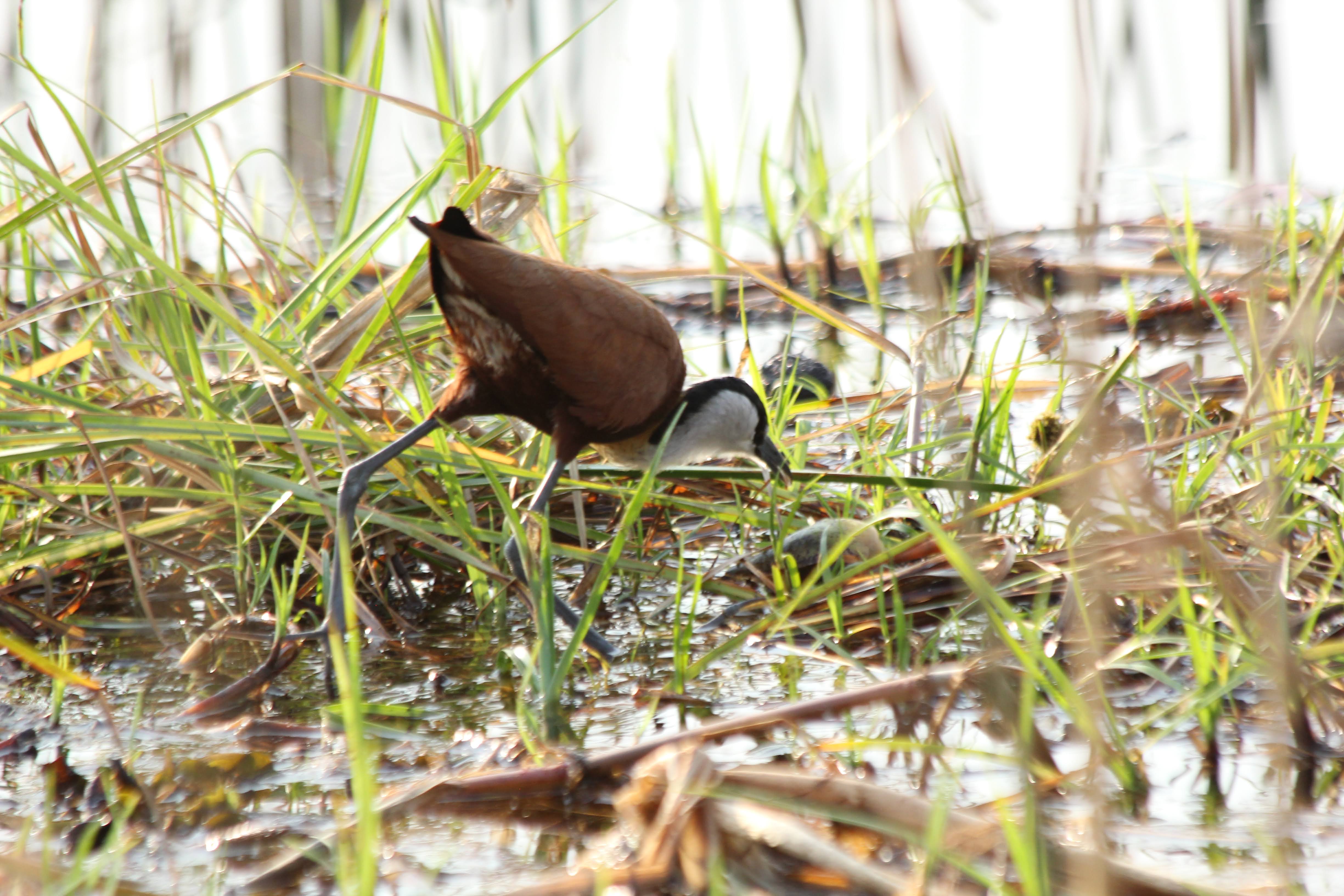 The African Jacana is a very small and somewhat funny looking bird that has huge feet that allow it to walk on top of lilly pads and other water vegitation. We saw a lot of these little guys around - they have a very notable coloring with the red, white, and black.