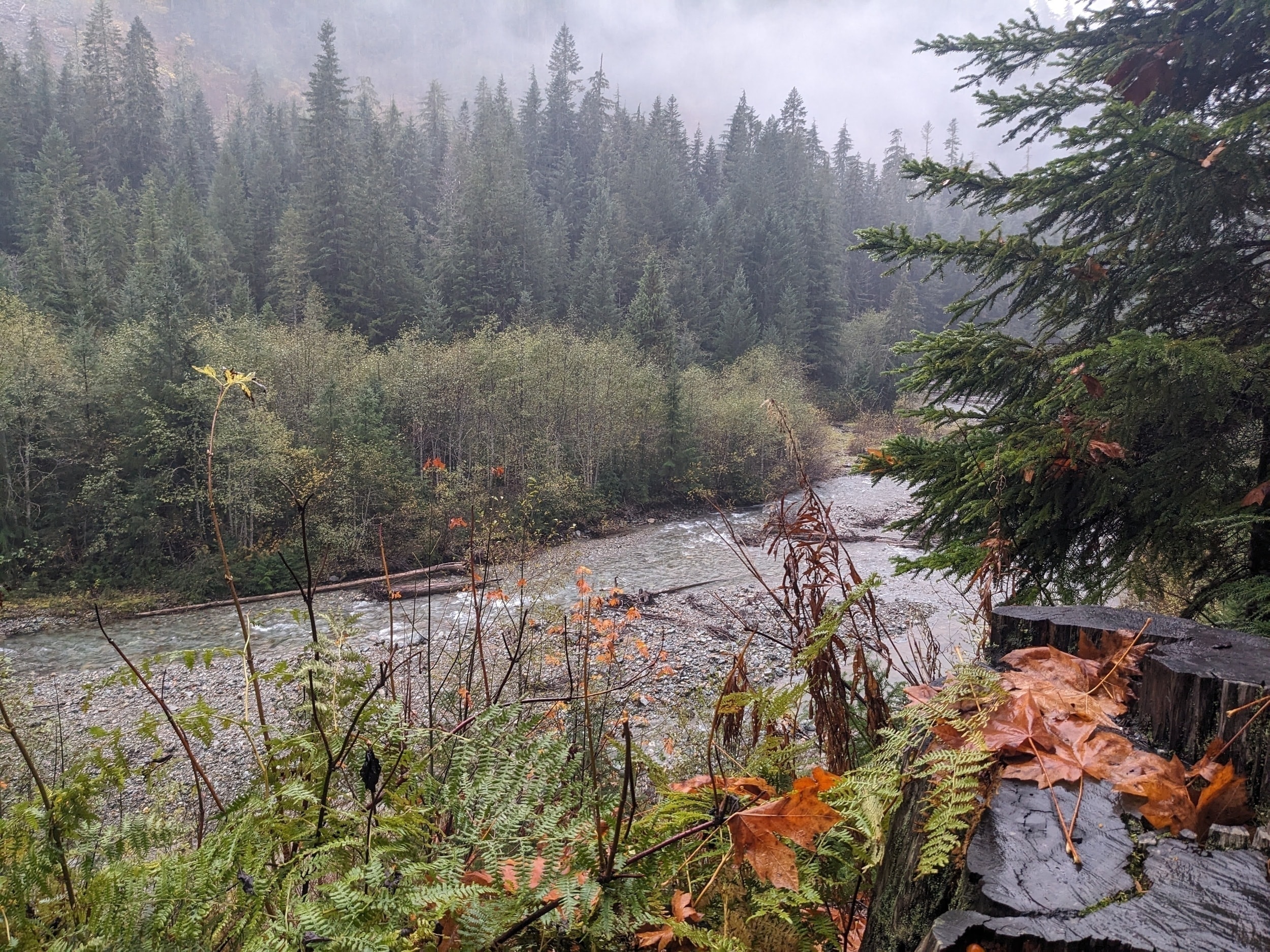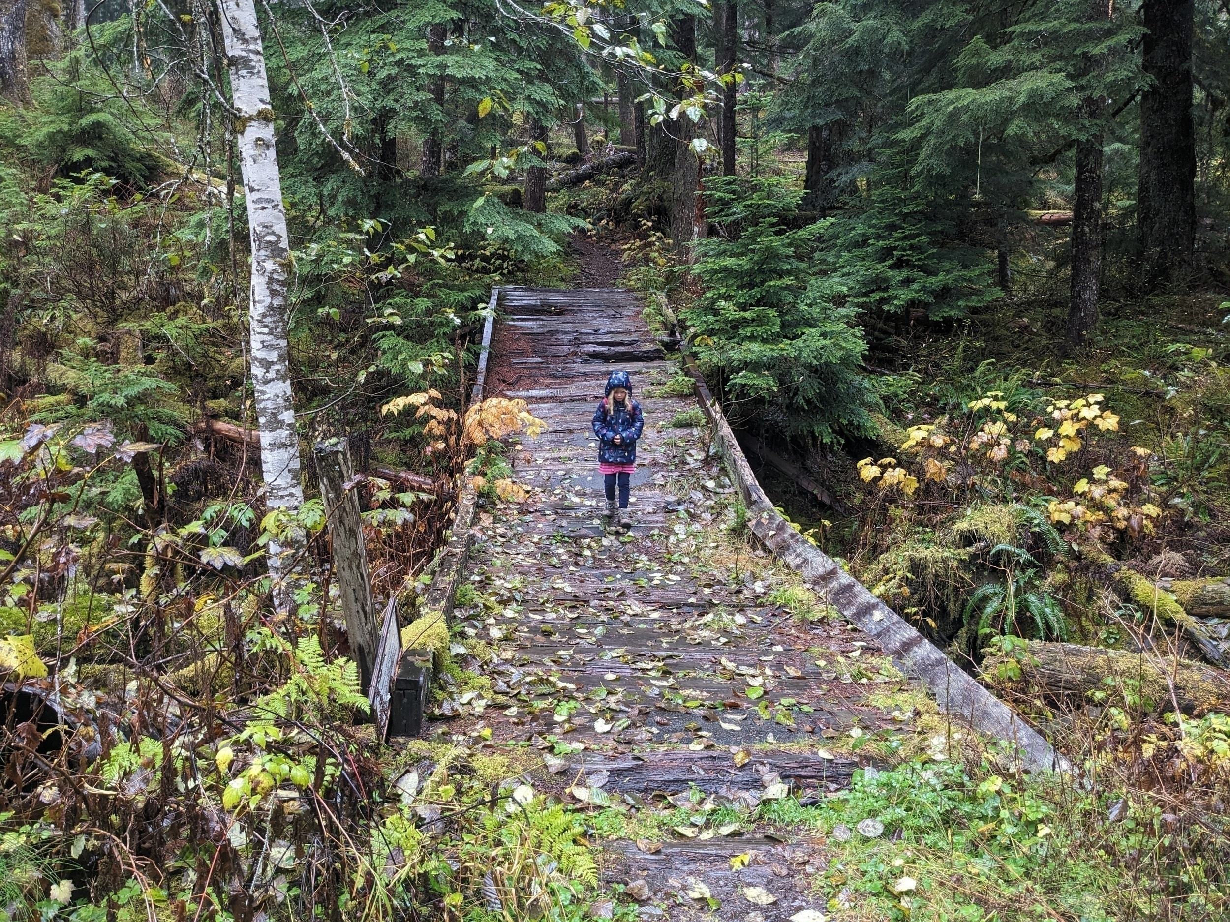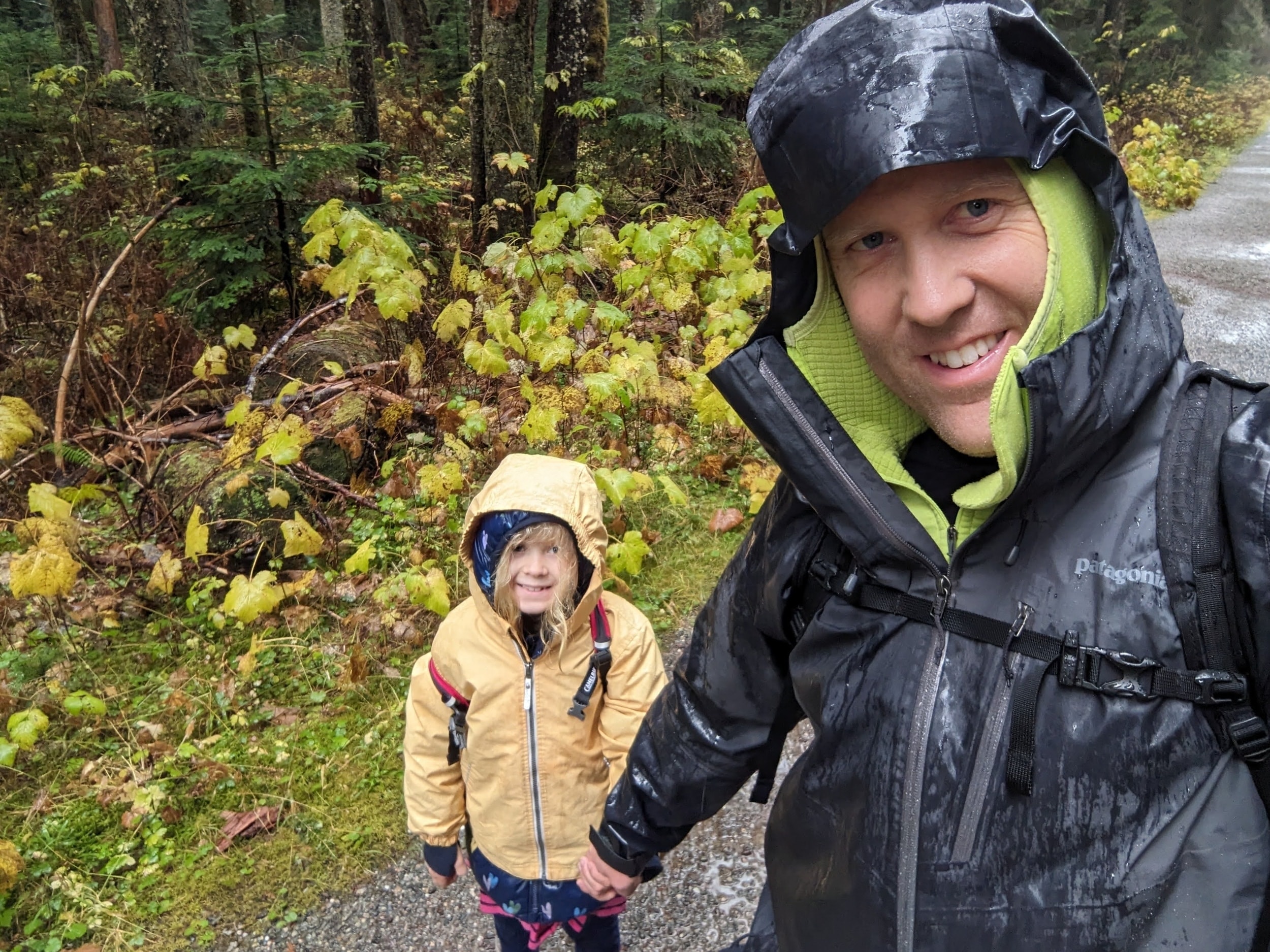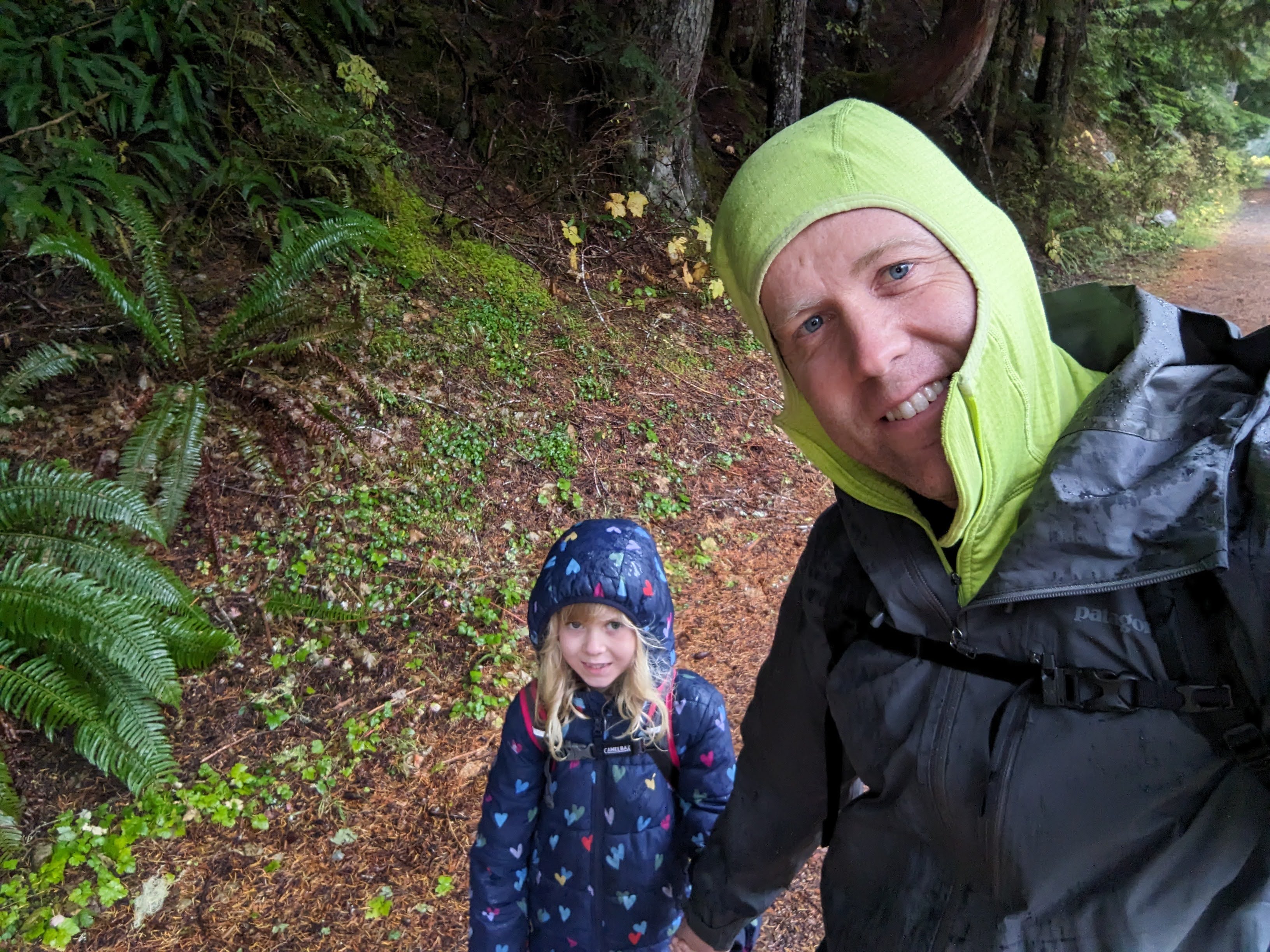 About 3 miles in (the hike was 4 miles out and 4 back), the rain really hit. We were soaked! We both put on our raincoats/hoods a little bit late, but not sure it mattered much. We were both warm enough though, so we continued. We made it to a slippery log bridge where we had to crawl across on our hands and knees to make sure we didn’t slip and fall into the stream.