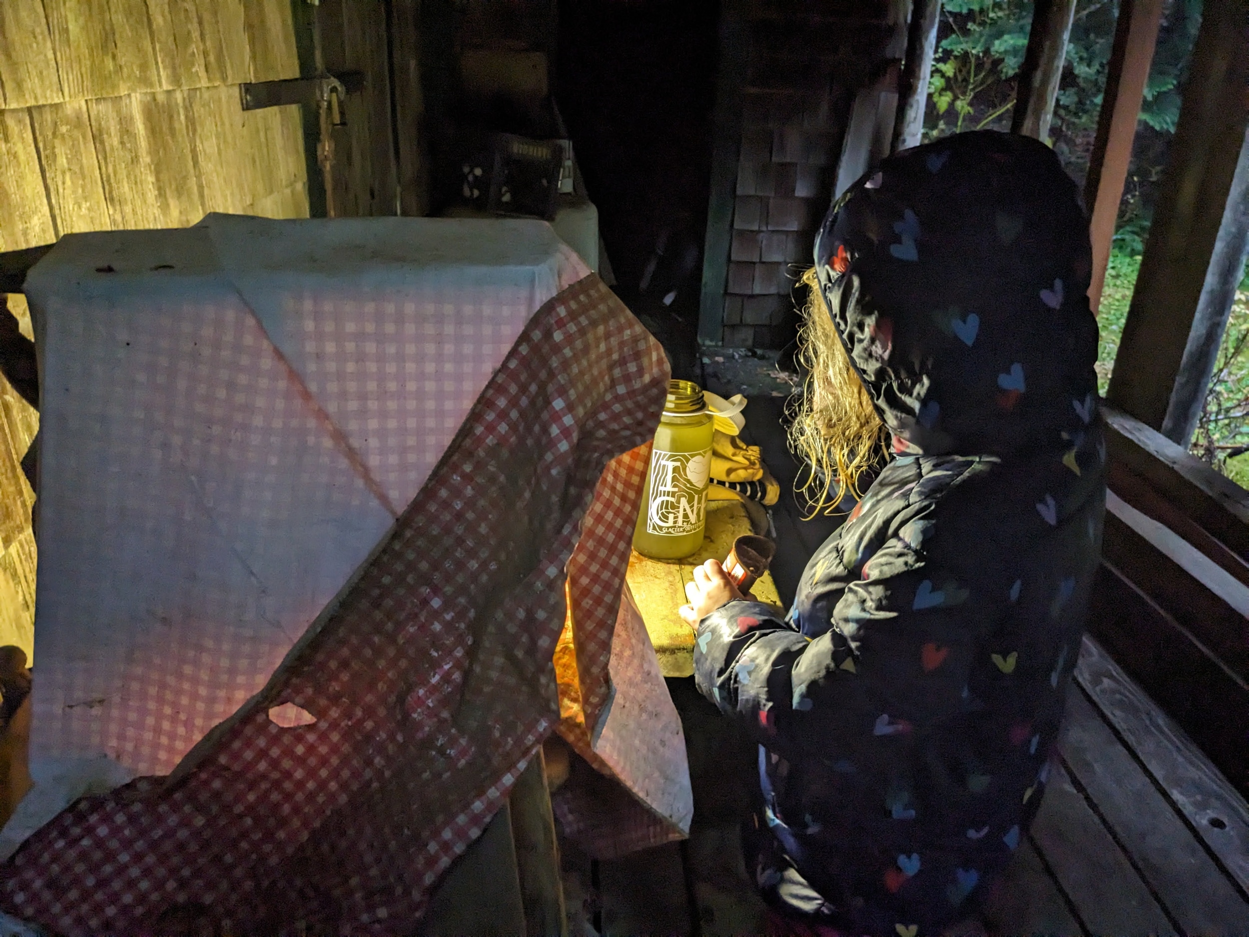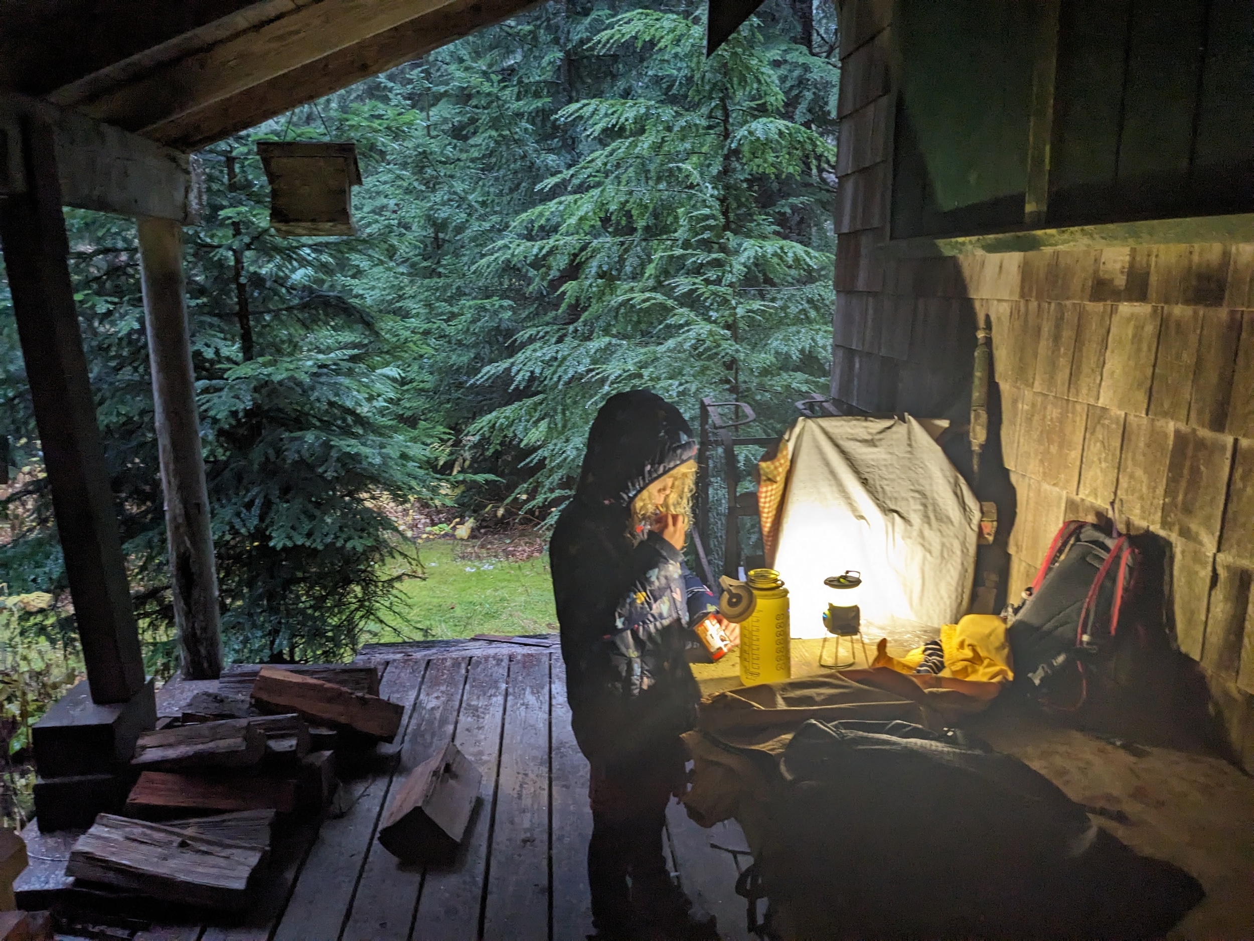 The 4 mile trip back continued to rain, but not as violently as it did right before we made it to the town. Unfortunately, it started to cool off significantly as the sun set. We made it back to the slippery log bridge, and crawled back across using our little lantern.