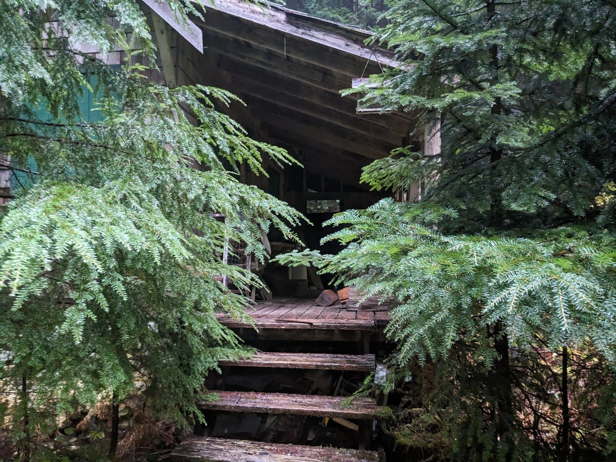 Our priority however was finding shelter, however, so we could grab a snack out of the rain before we head back. We continued on for another half mile or so before we found this small cabin a little bit deeper into the woods. The cabin was locked (based on how a lot of the town looked, it seems like there is a lot of vandalism here), but there was a small patio that was reasonably dry. We laid out our snacks on a small table and ate up (and warmed up) before we were off to finish up the trip.